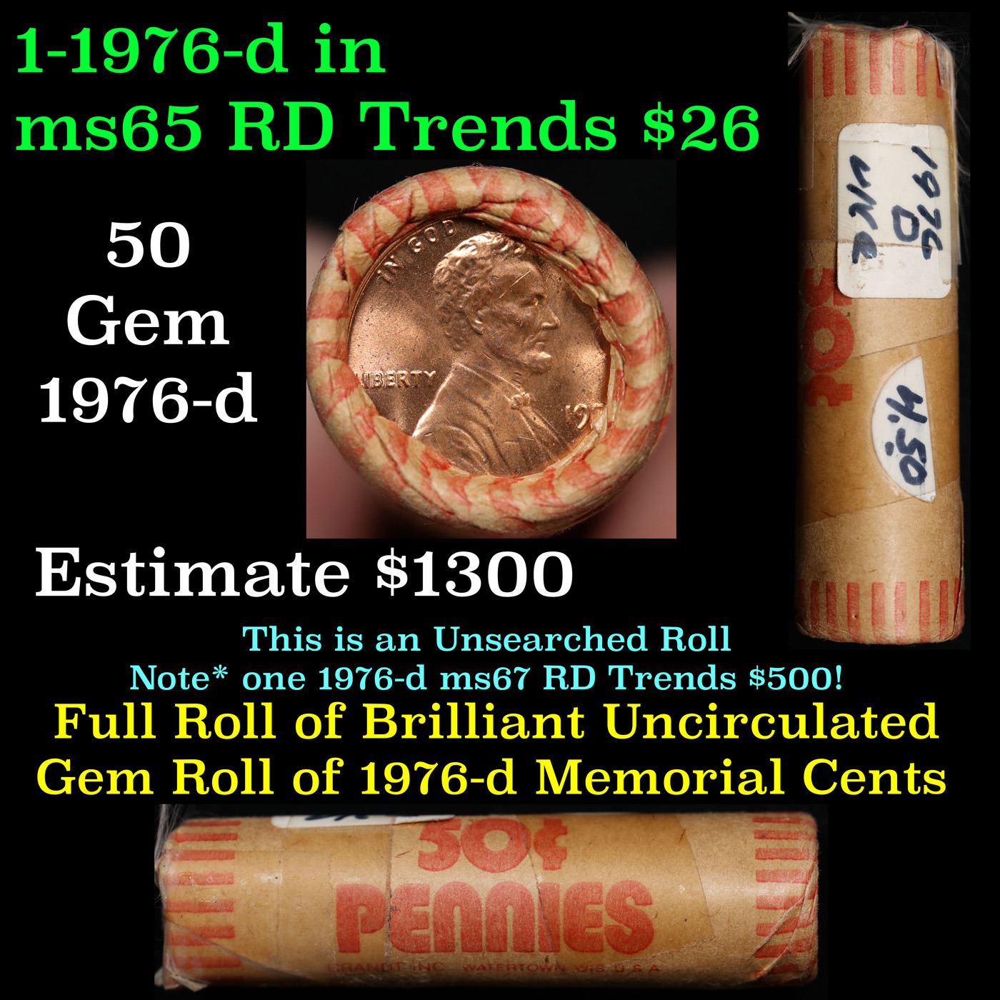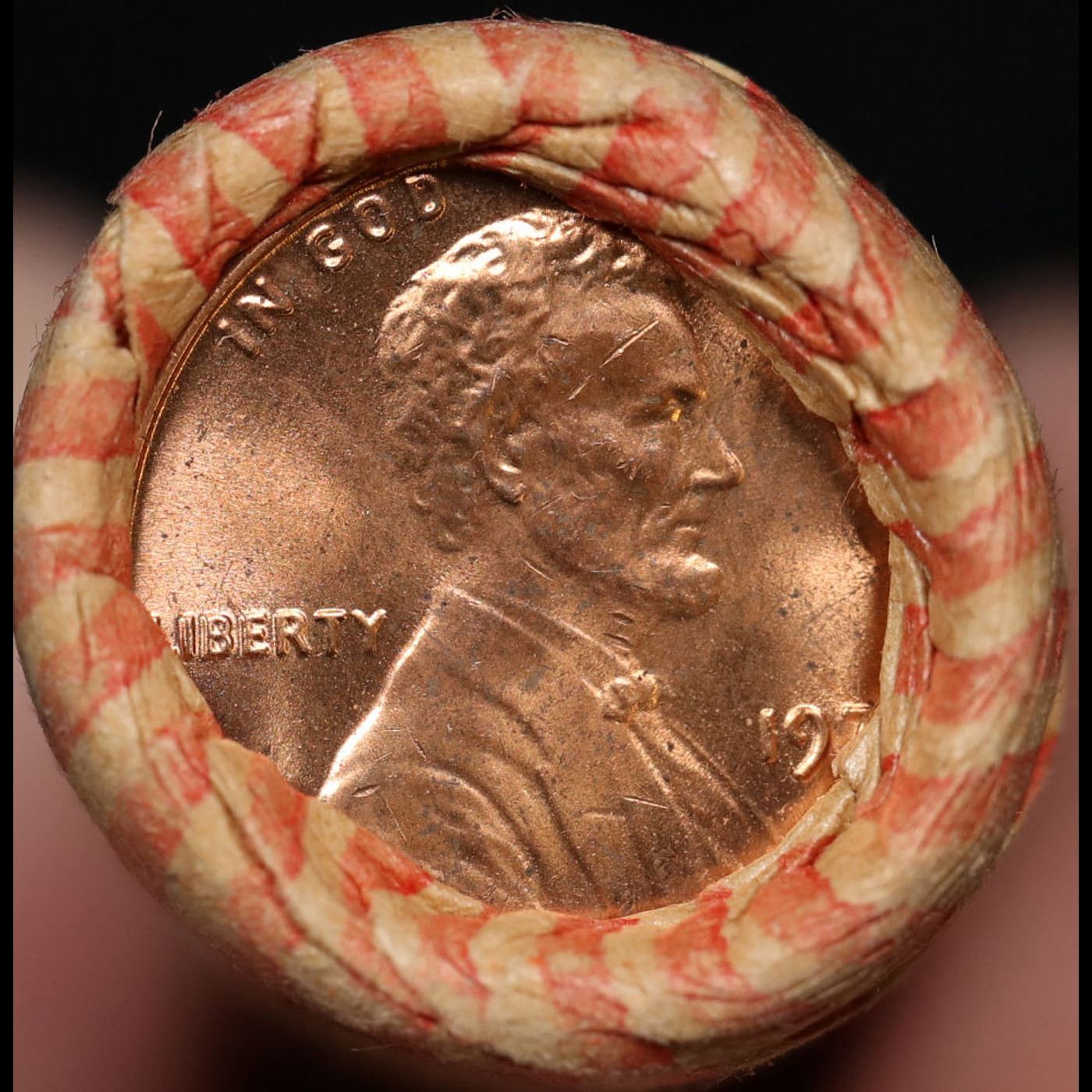 Shotgun Lincoln 1c roll, 1976-d 50 pcs Bank Wrapper.. A terrific Shotgun roll of Lincoln cents. Most if not all coin should be cherry red.
