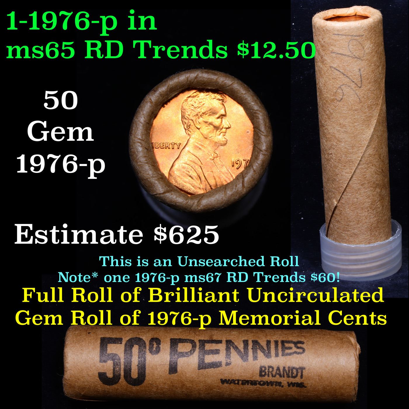 Shotgun Lincoln 1c roll, 1976-p 50 pcs Brandt Wrapper. A terrific Shotgun roll of Lincoln cents. All coins cherry red. Trends ms65 rd $12.50 Estimate $625