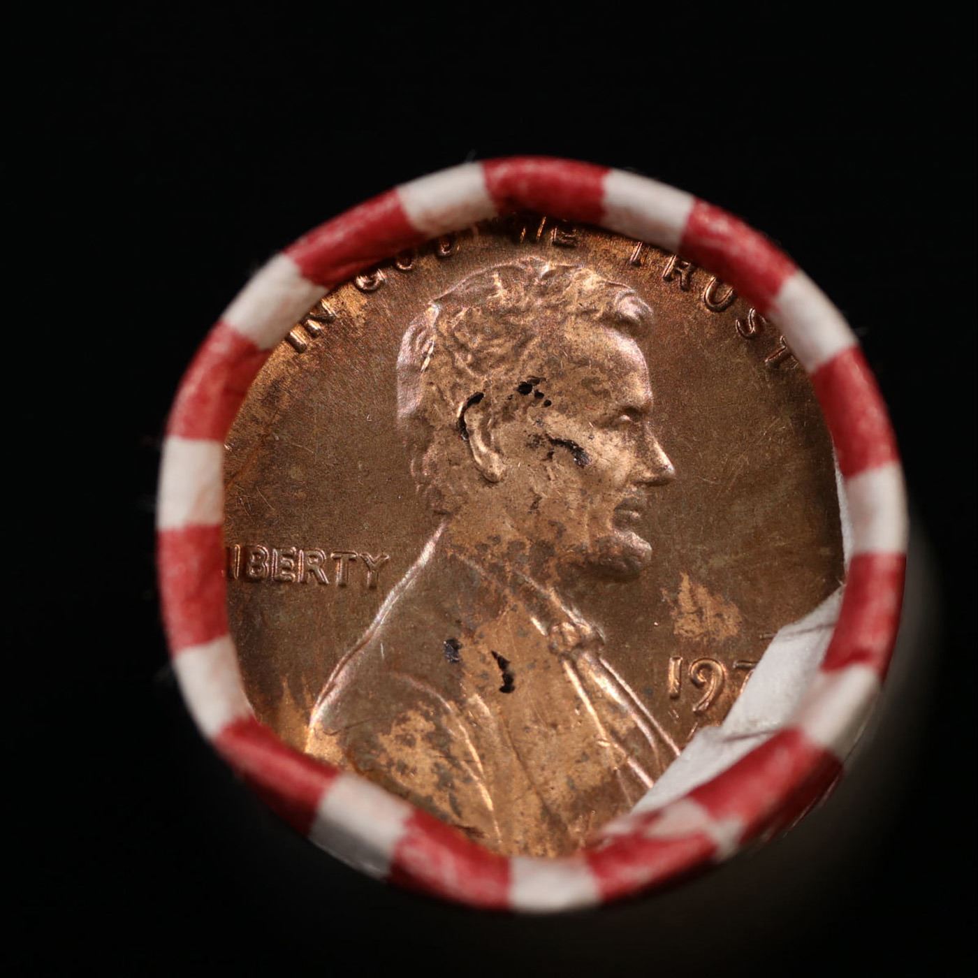 Shotgun Lincoln 1c roll, 1977-d 50 pcs Bank Wrapper.. A terrific Shotgun roll of Lincoln cents. Most if not all coin should be cherry red.