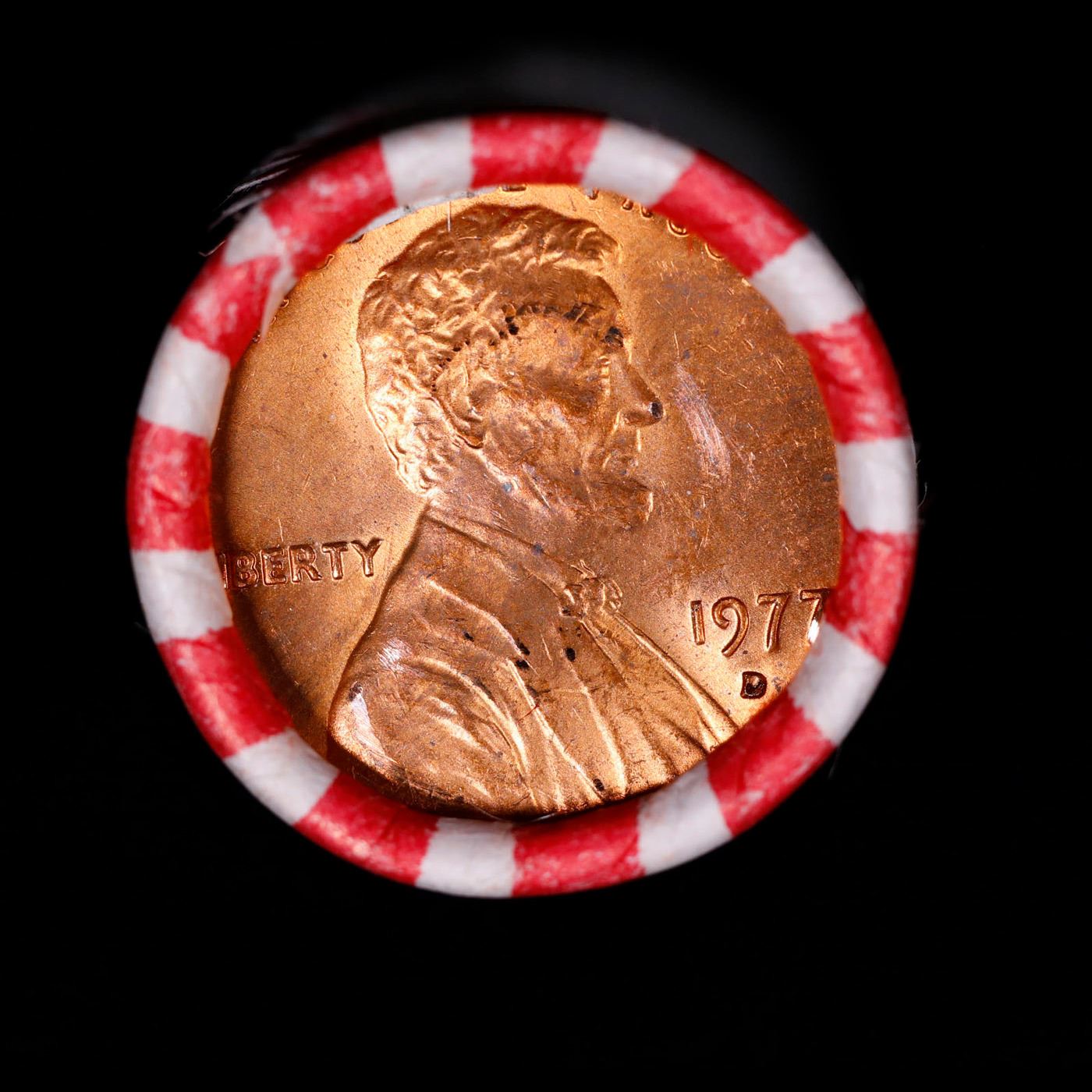 Shotgun Lincoln 1c roll, 1977-d 50 pcs Bank Wrapper.. A terrific Shotgun roll of Lincoln cents. Most if not all coin should be cherry red.