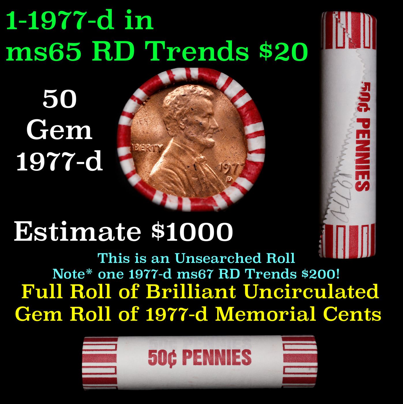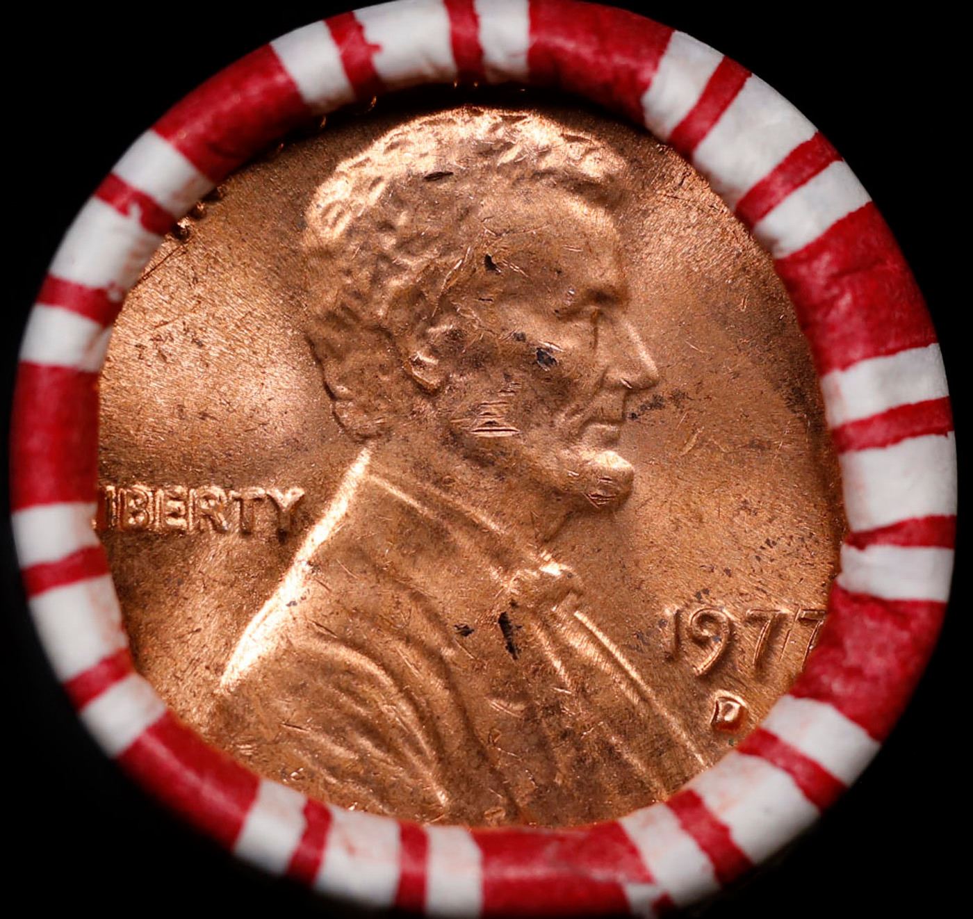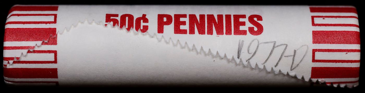 Shotgun Lincoln 1c roll, 1977-d 50 pcs Bank Wrapper.. A terrific Shotgun roll of Lincoln cents. Most if not all coin should be cherry red.