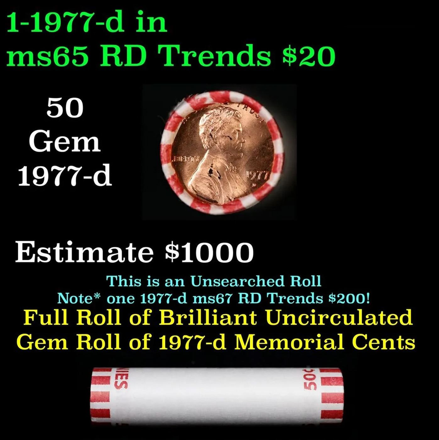 Shotgun Lincoln 1c roll, 1977-d 50 pcs Brandt 50c Wrapper.. A terrific Shotgun roll of Lincoln cents. Most if not all coin should be cherry red.
