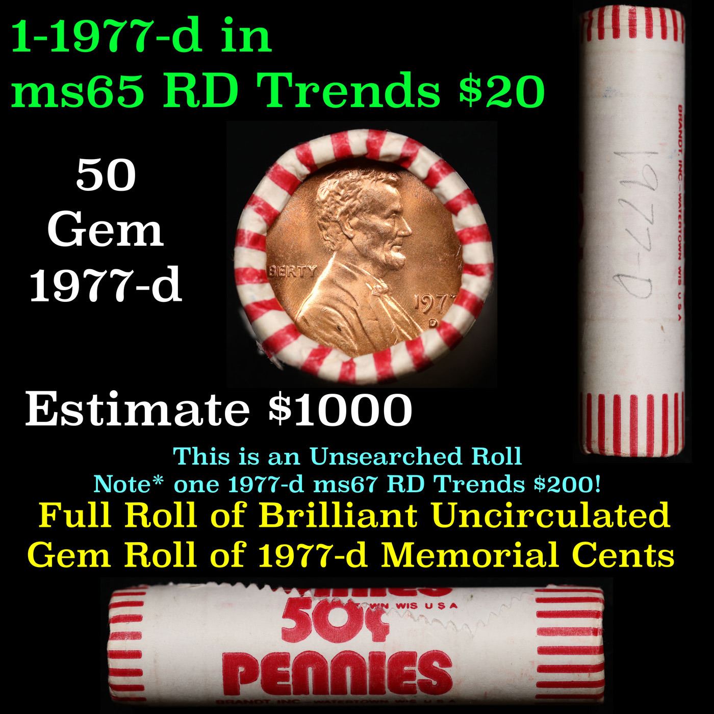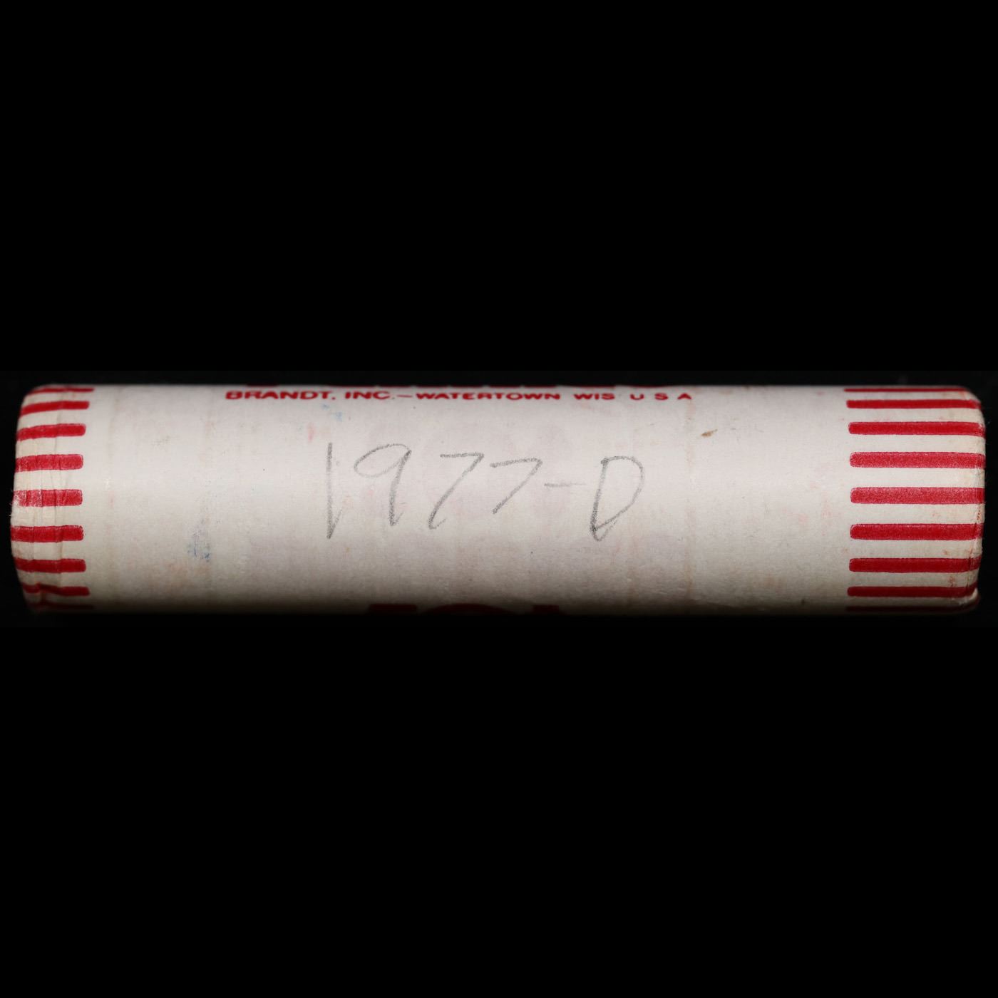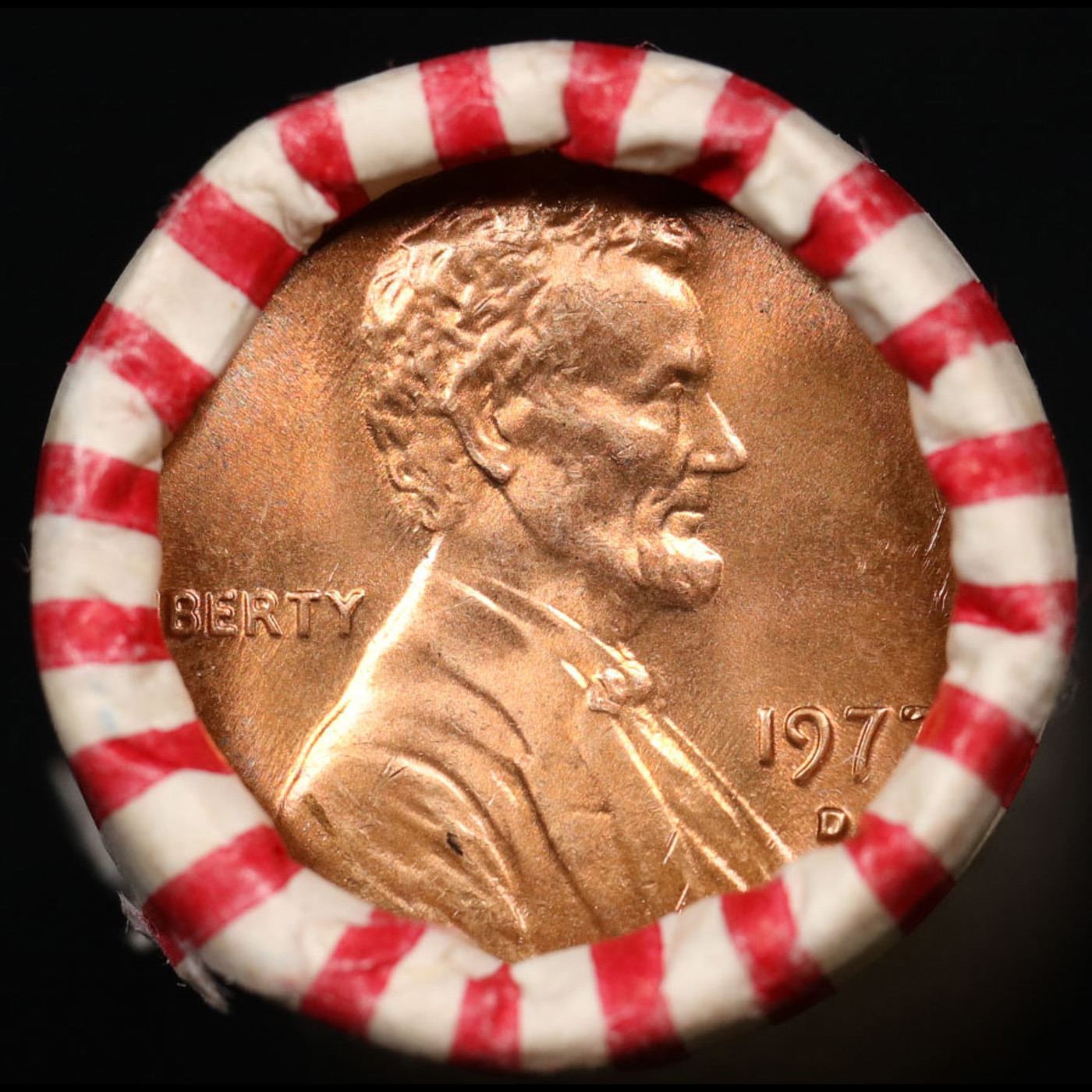 Shotgun Lincoln 1c roll, 1977-d 50 pcs Brandt Wrapper.. A terrific Shotgun roll of Lincoln cents. Most if not all coin should be cherry red.