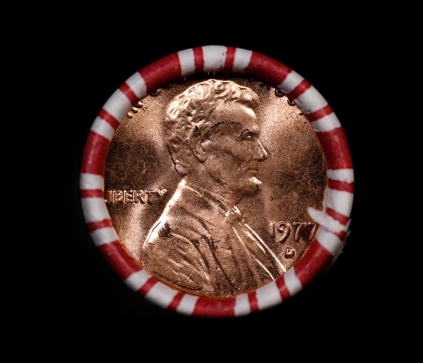 Shotgun Lincoln 1c roll, 1977-d 50 pcs Steel-Strong Wrapper.. A terrific Shotgun roll of Lincoln cents. Most if not all coin should be cherry red.
