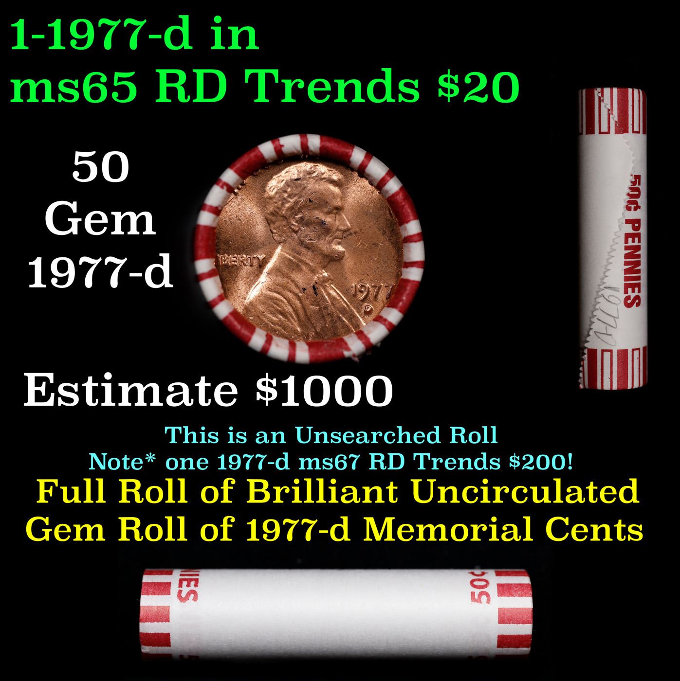 Shotgun Lincoln 1c roll, 1977-d 50 pcs Steel-Strong Wrapper.. A terrific Shotgun roll of Lincoln cents. Most if not all coin should be cherry red.