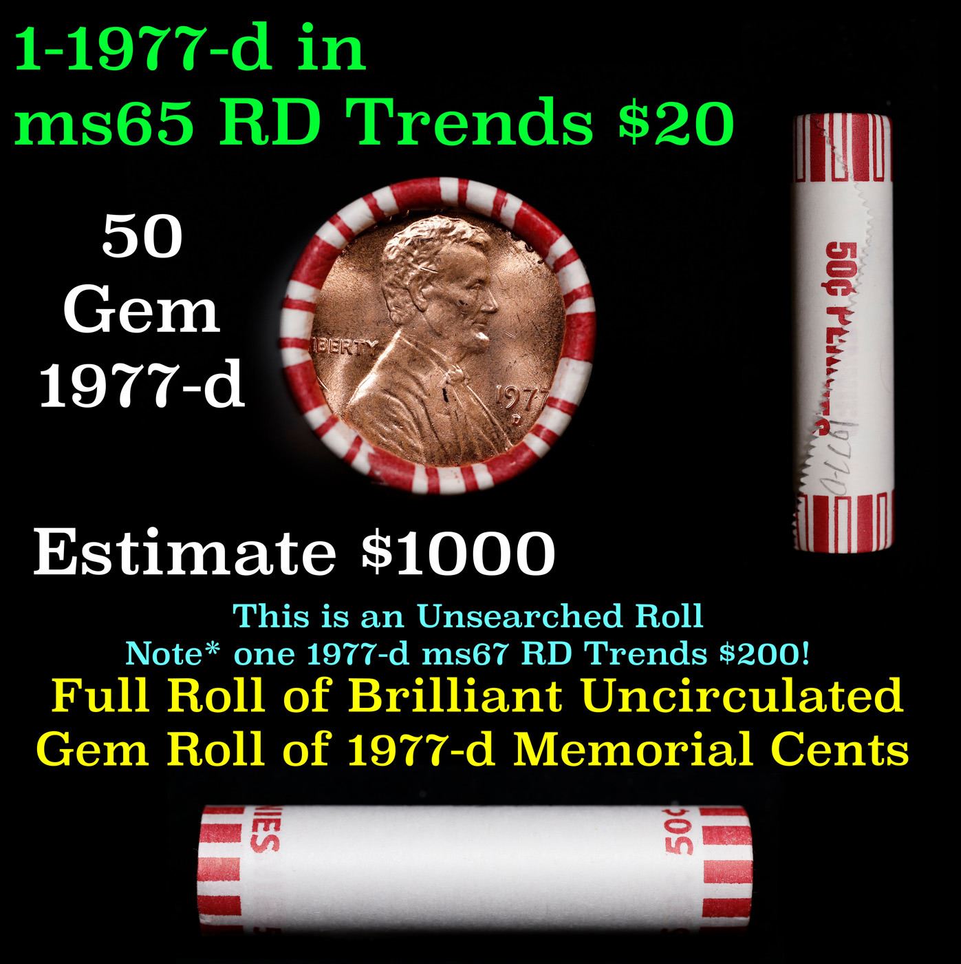 Shotgun Lincoln 1c roll, 1977-d 50 pcs Steel-Strong Wrapper.. A terrific Shotgun roll of Lincoln cents. Most if not all coin should be cherry red.