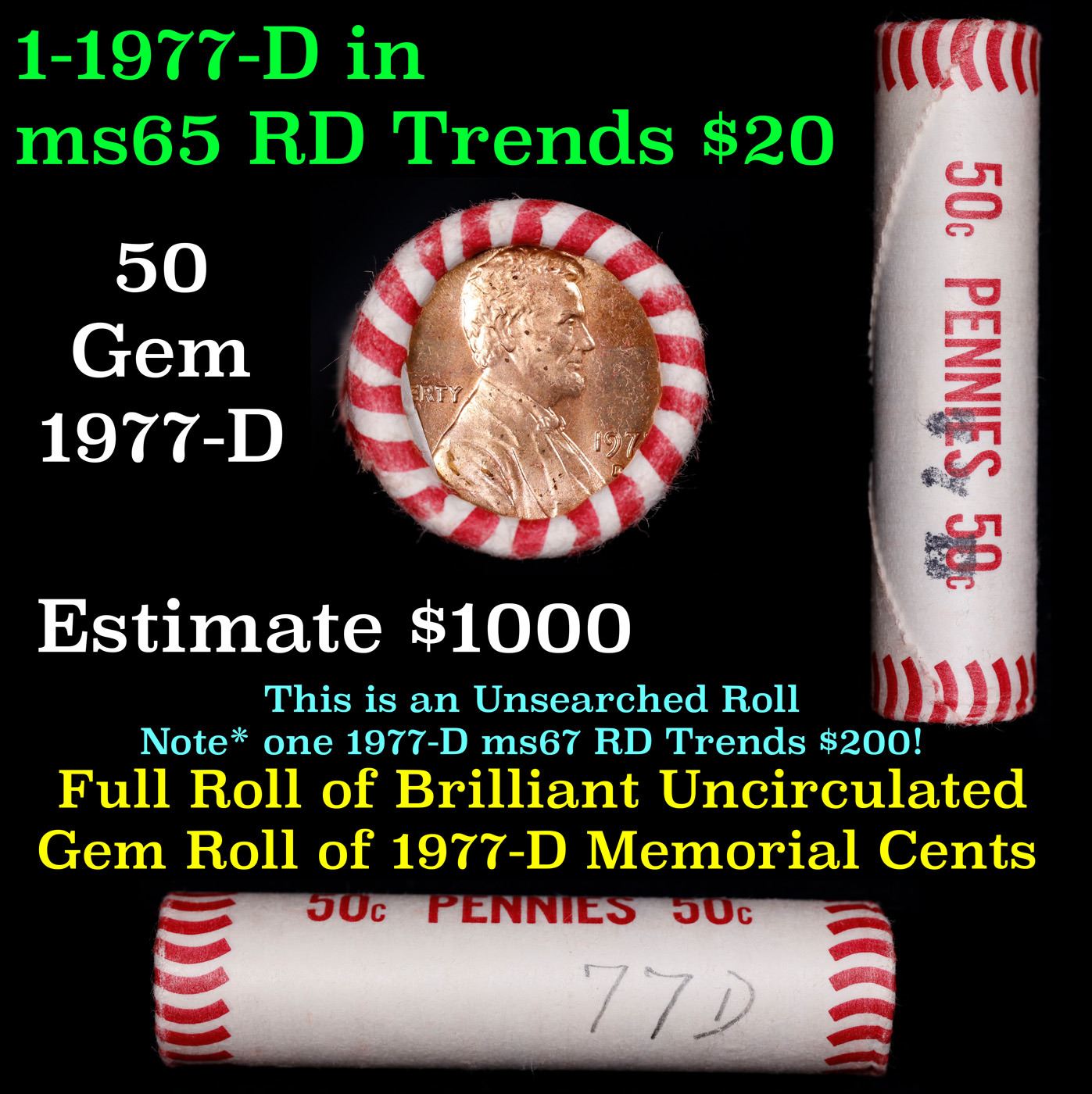 Shotgun Lincoln 1c roll, 1977-d 50 pcs Wrapper . A terrific Shotgun roll of Lincoln cents. All coins appear to be cherry red. Trends ms65 rd $20