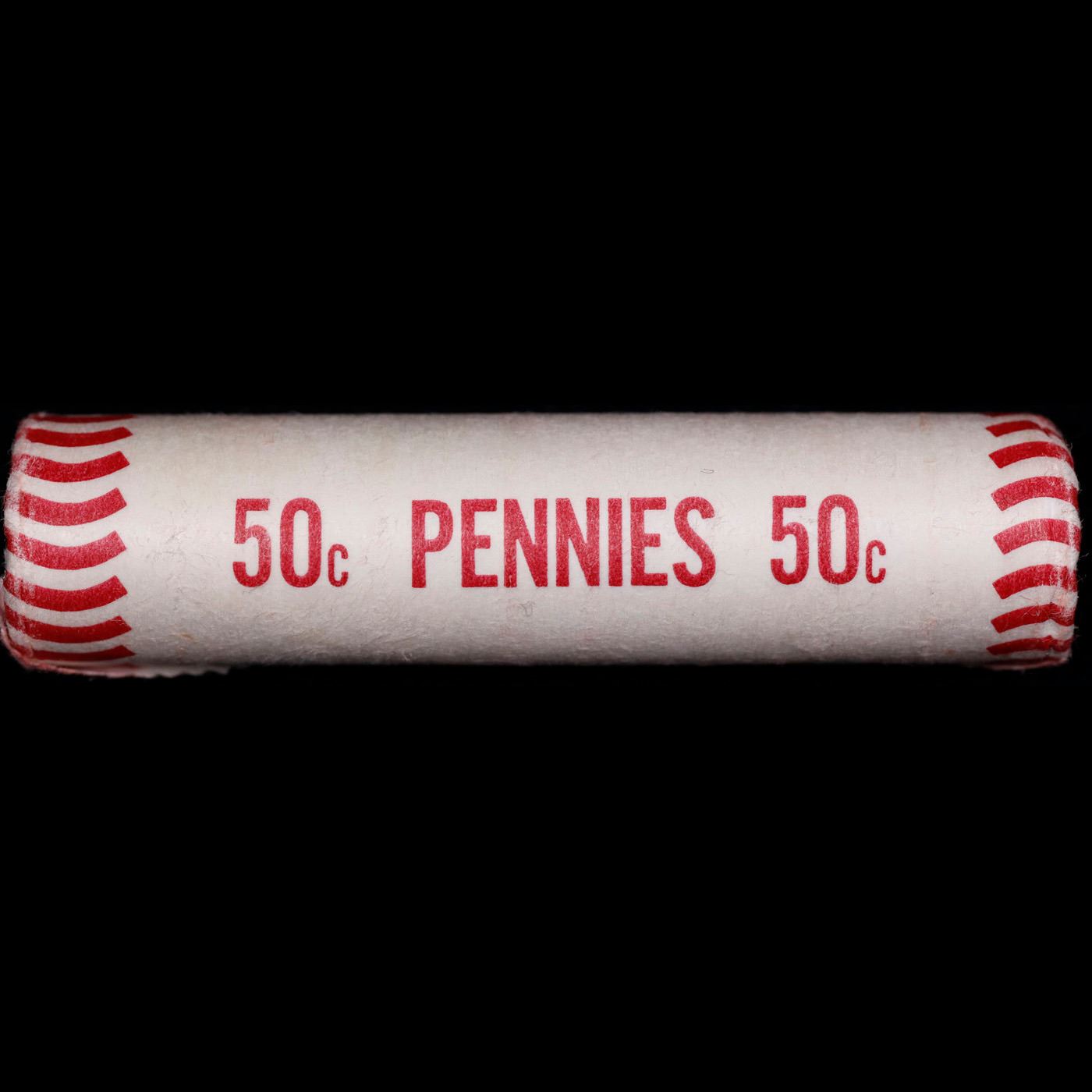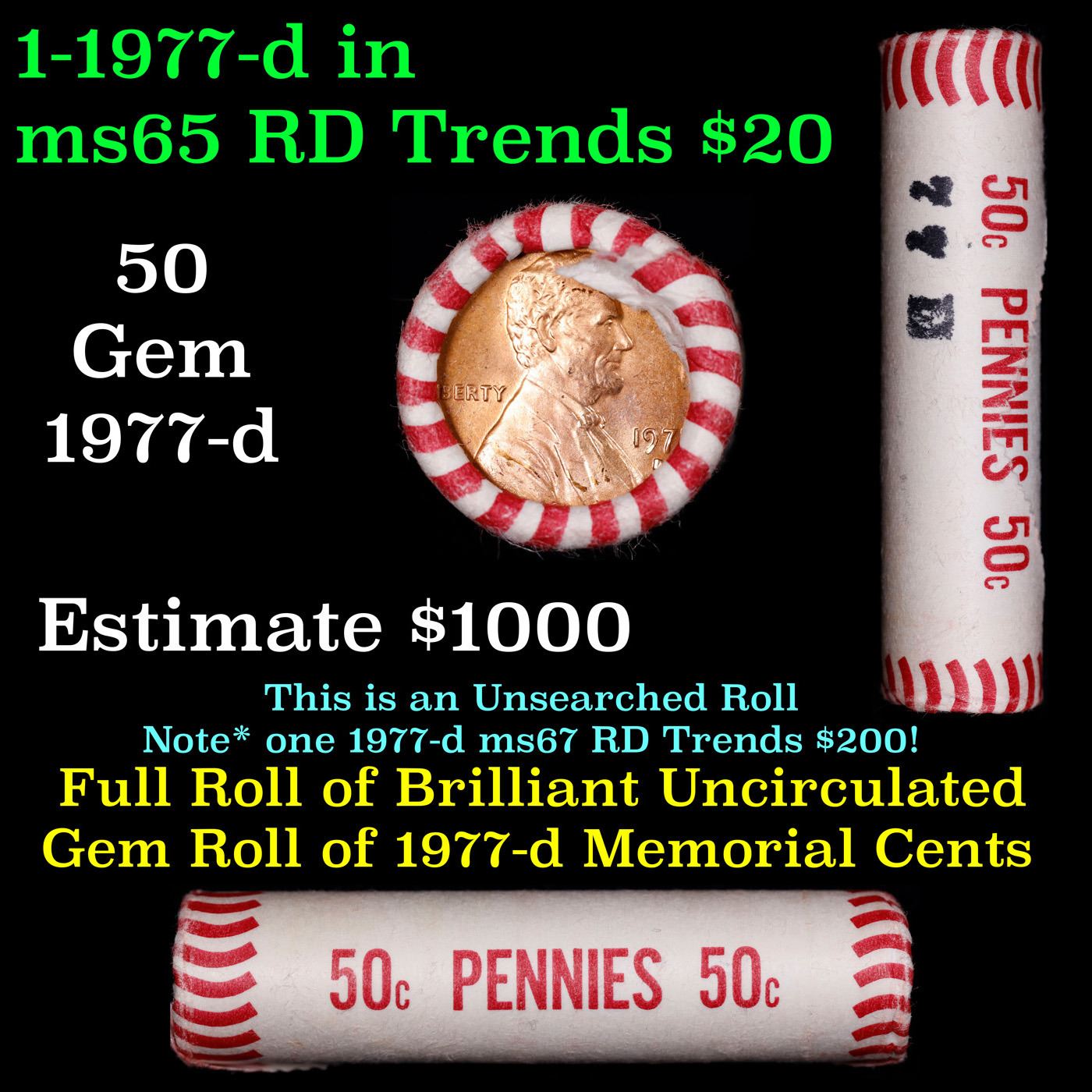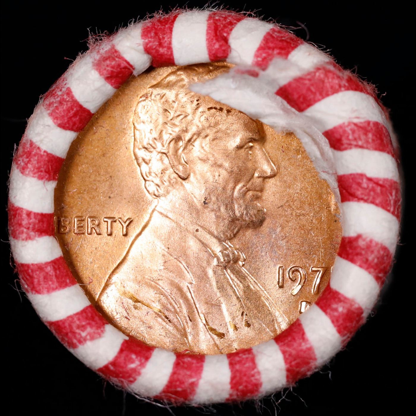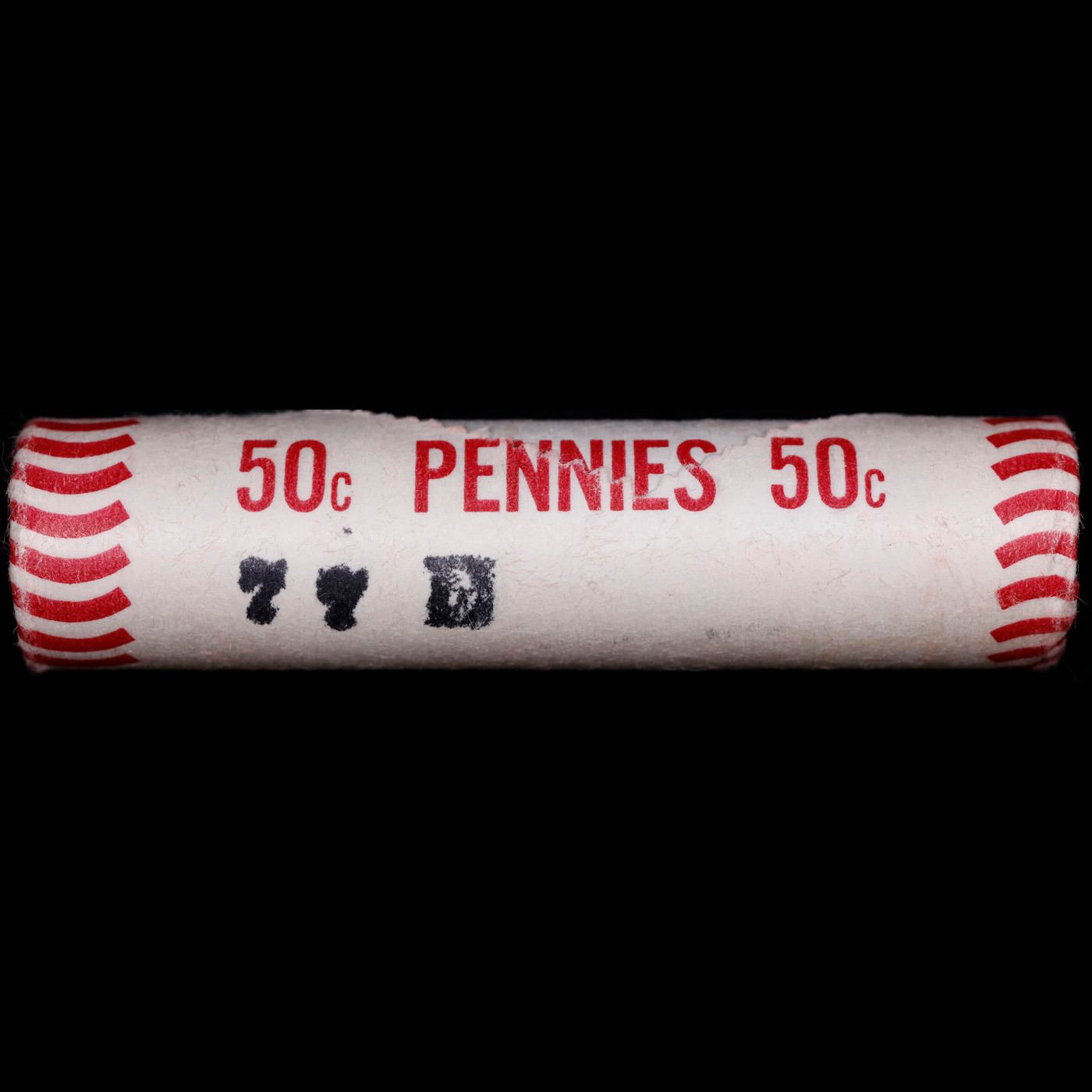Shotgun Lincoln 1c roll, 1977-d 50 pcs Wrapper . A terrific Shotgun roll of Lincoln cents. All coins appear to be cherry red. Trends ms65 rd $20