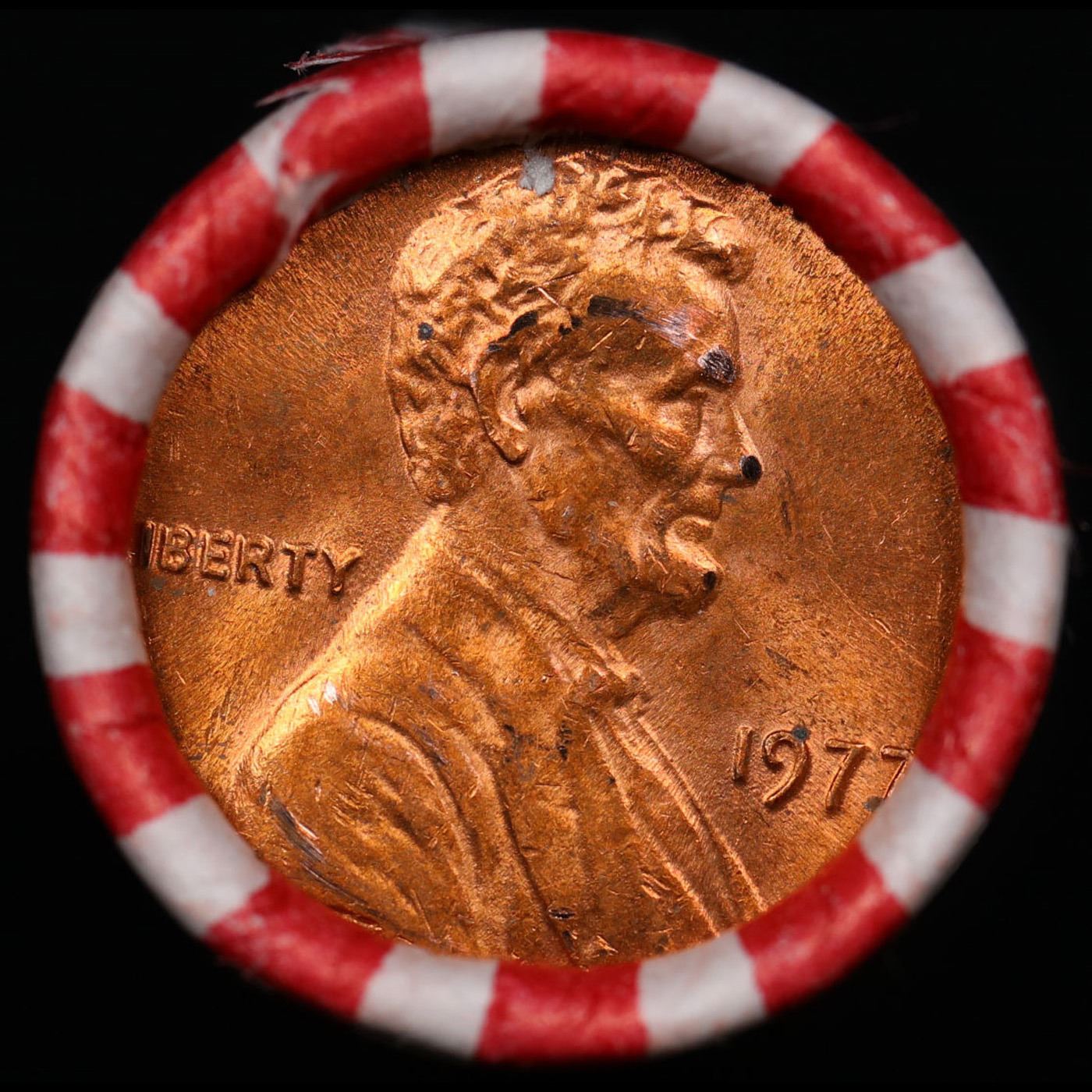 Shotgun Lincoln 1c roll, 1977-p 50 pcs Bank Wrapper.. A terrific Shotgun roll of Lincoln cents. Most if not all coin should be cherry red.