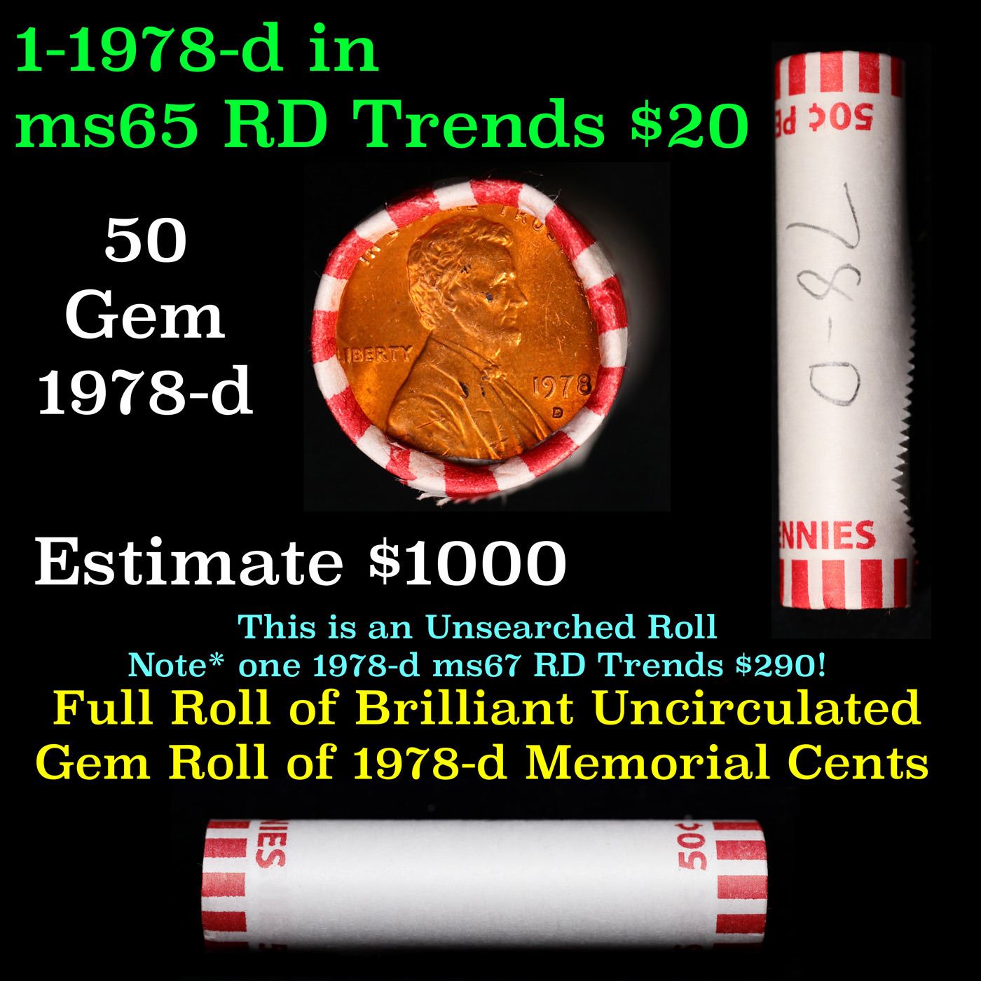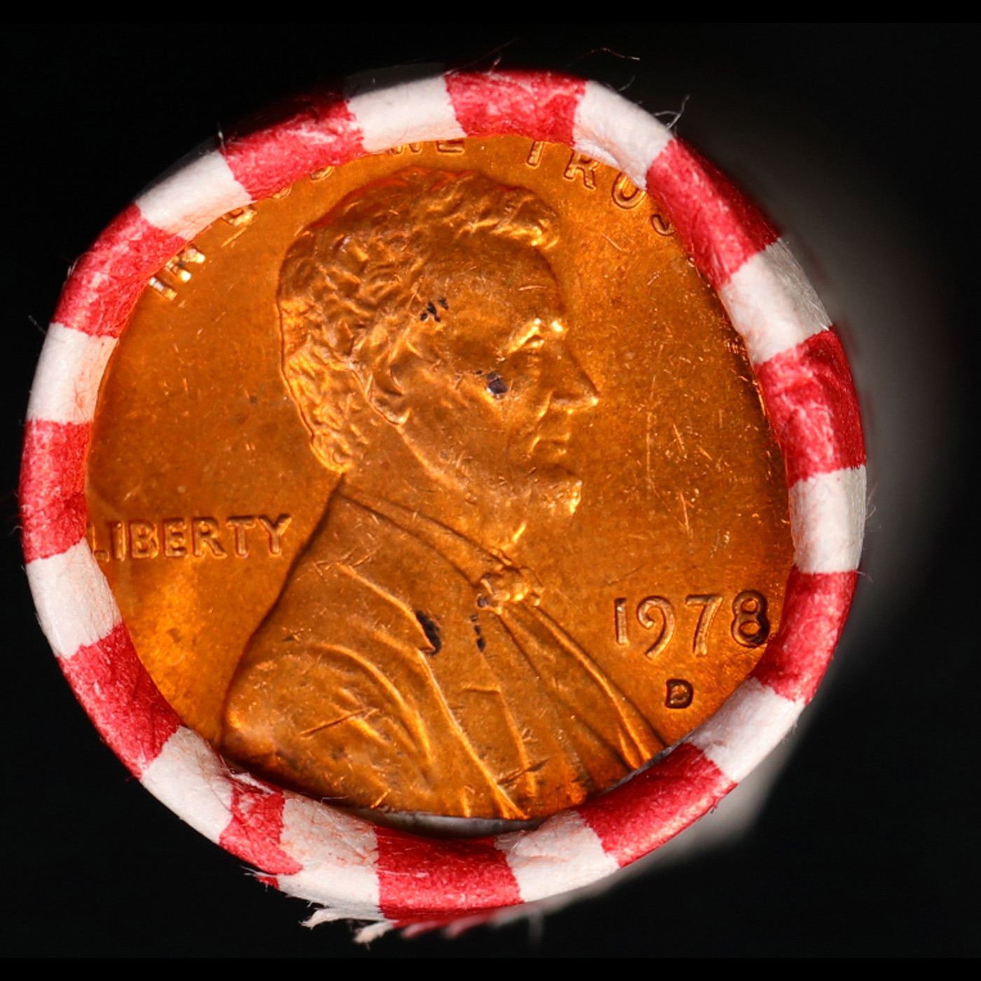 Shotgun Lincoln 1c roll, 1978-d 50 pcs Bank Wrapper.. A terrific Shotgun roll of Lincoln cents. Most if not all coin should be cherry red.
