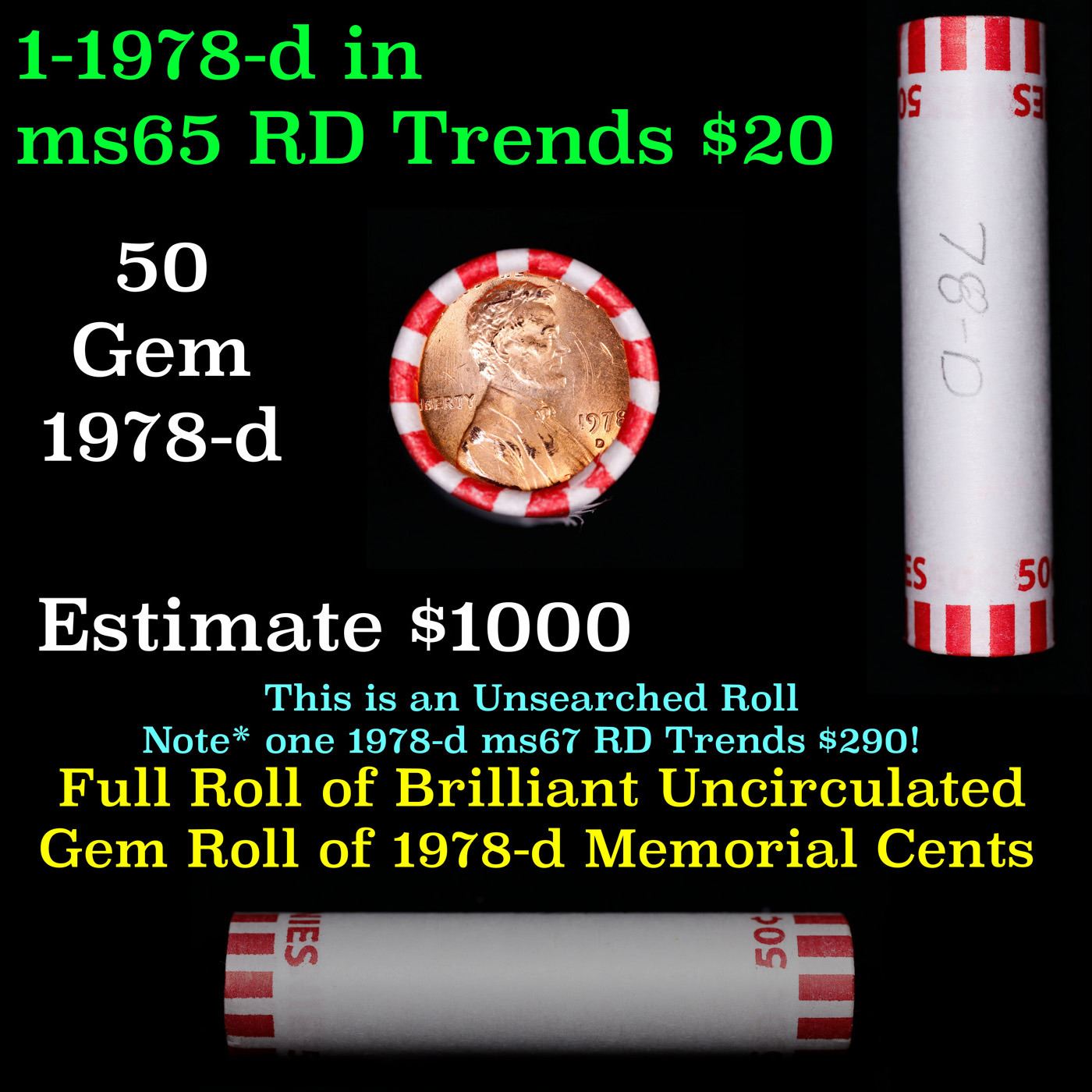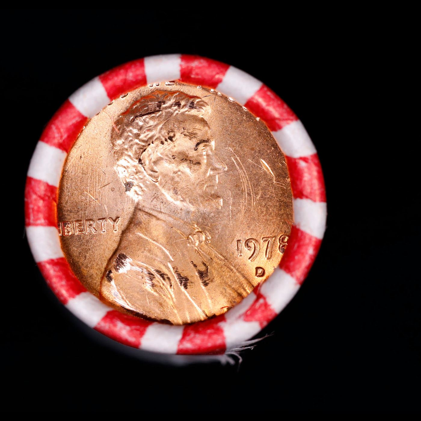 Shotgun Lincoln 1c roll, 1978-d 50 pcs Bank Wrapper.. A terrific Shotgun roll of Lincoln cents. Most if not all coin should be cherry red.