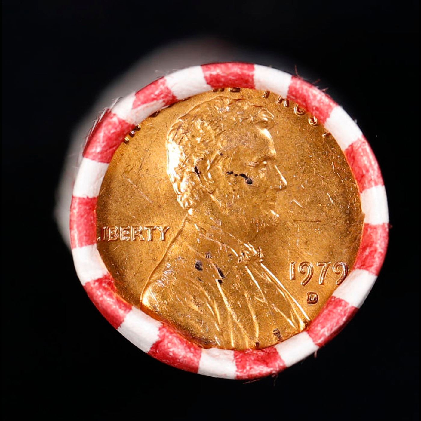 Shotgun Lincoln 1c roll, 1979-d 50 pcs Bank Wrapper.. A terrific Shotgun roll of Lincoln cents. Most if not all coin should be cherry red.
