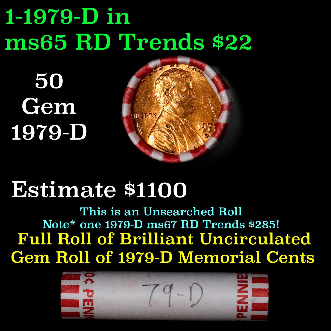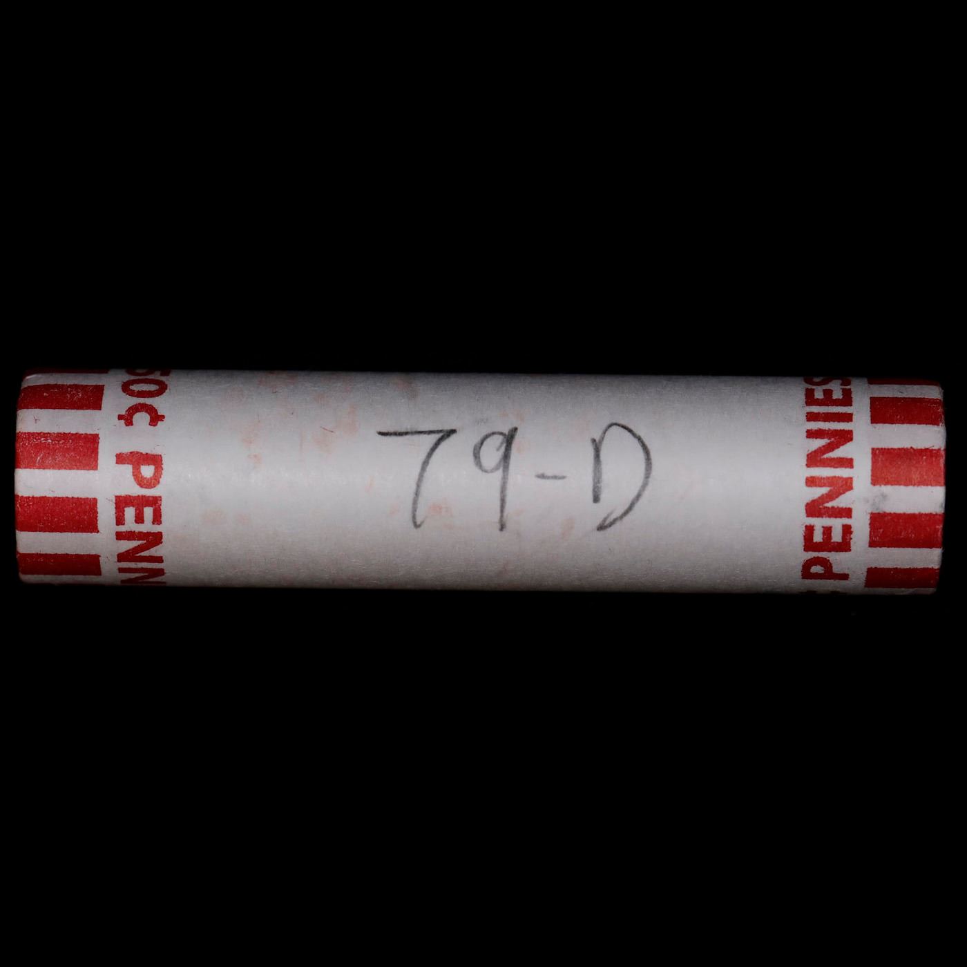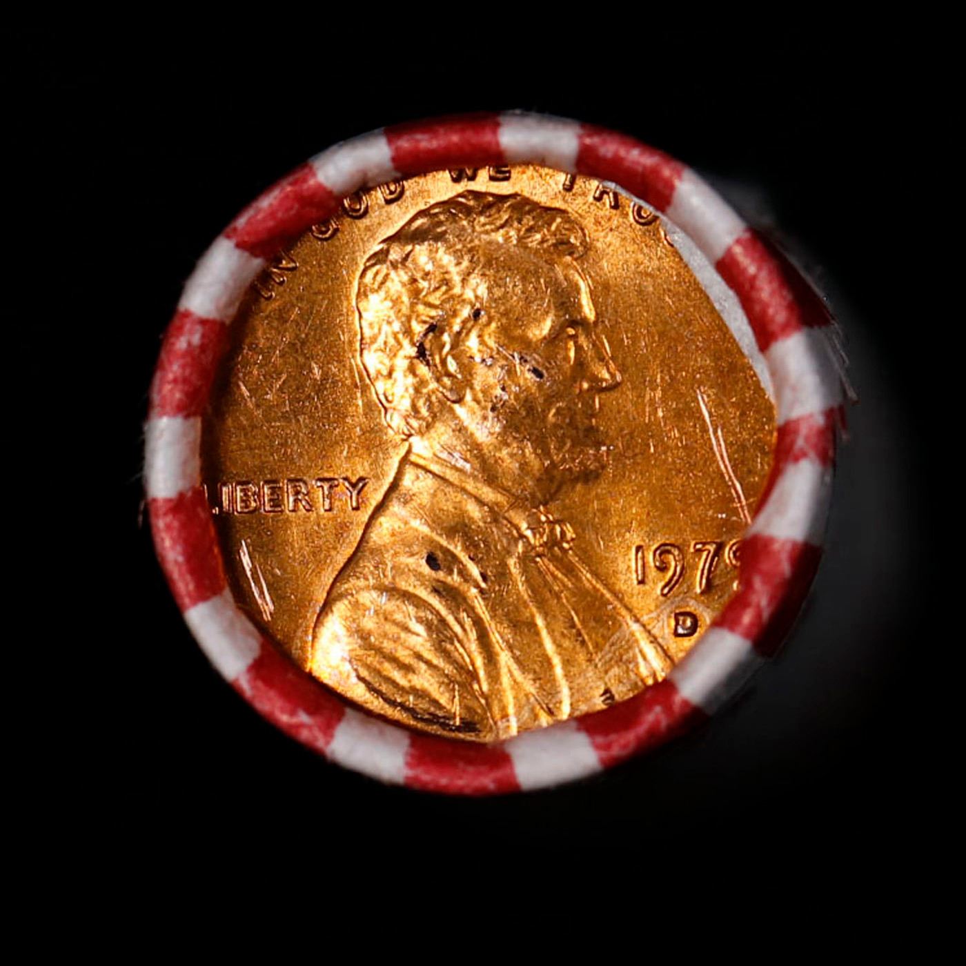Shotgun Lincoln 1c roll, 1979-d 50 pcs Bank Wrapper.. A terrific Shotgun roll of Lincoln cents. Most if not all coin should be cherry red.
