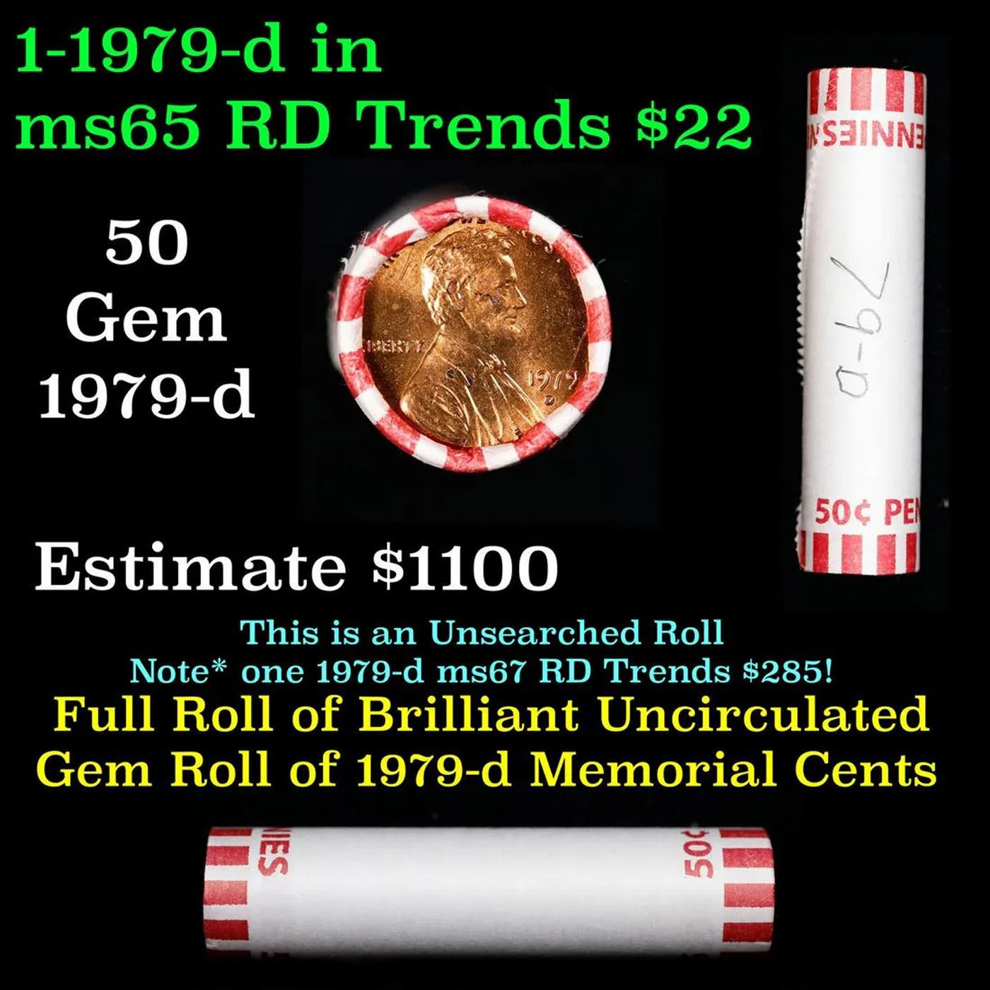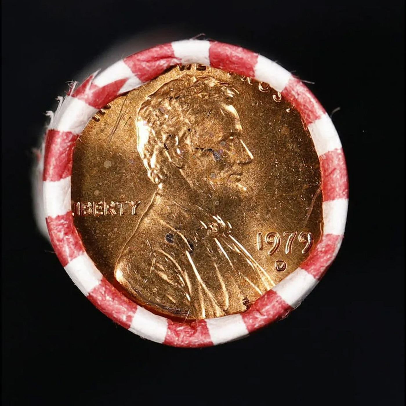 Shotgun Lincoln 1c roll, 1979-d 50 pcs Bank Wrapper.. A terrific Shotgun roll of Lincoln cents. Most if not all coin should be cherry red.