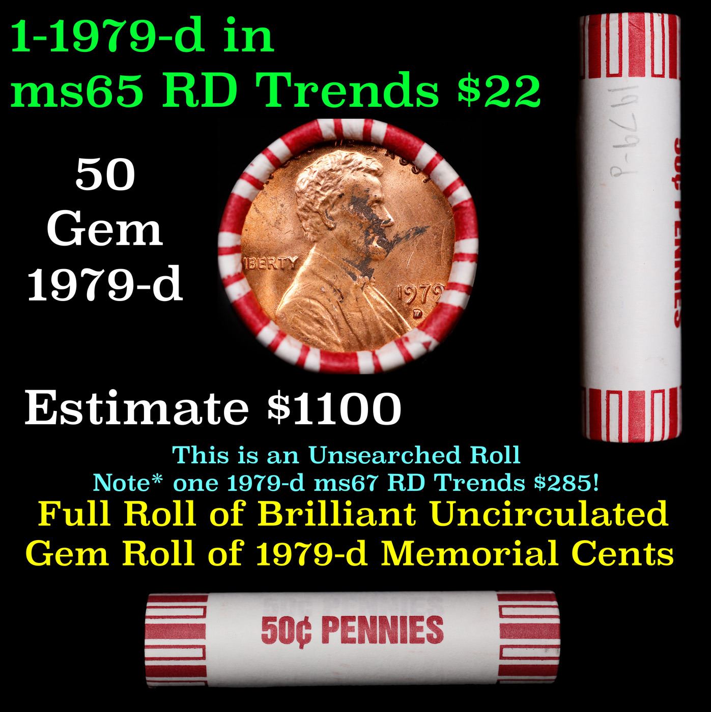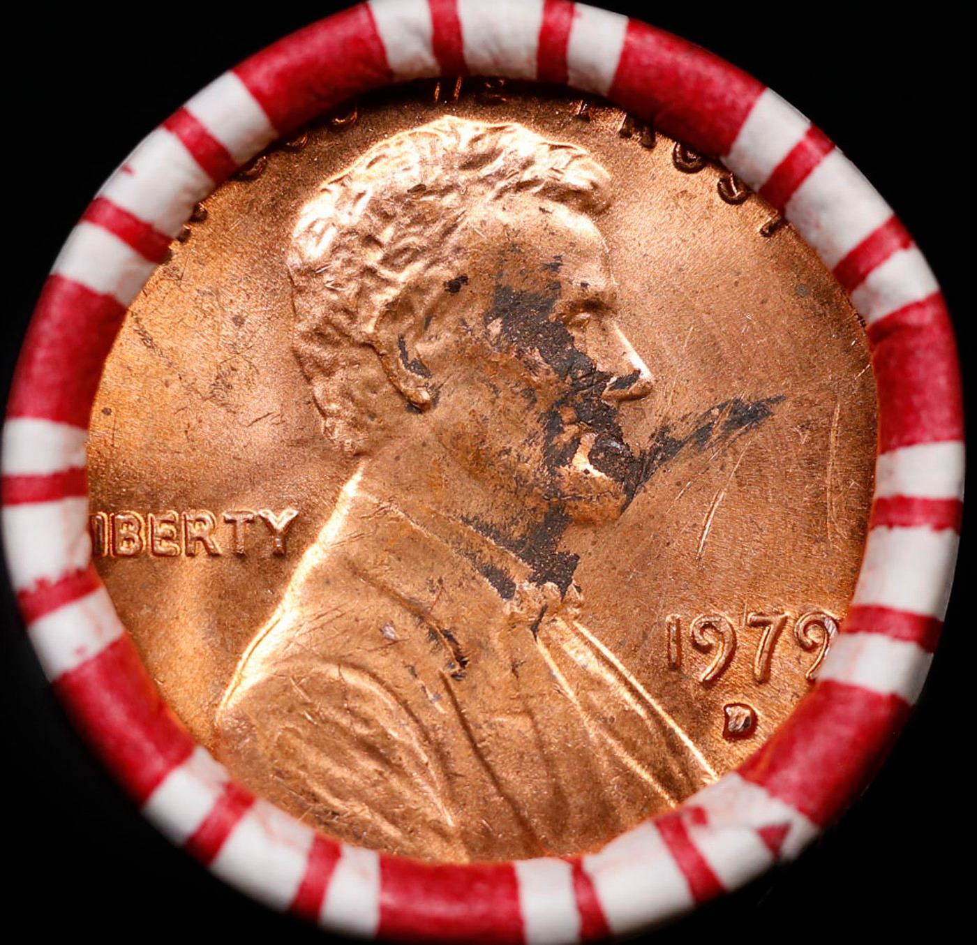 Shotgun Lincoln 1c roll, 1979-d 50 pcs Brandt 50c Wrapper.. A terrific Shotgun roll of Lincoln cents. Most if not all coin should be cherry red.