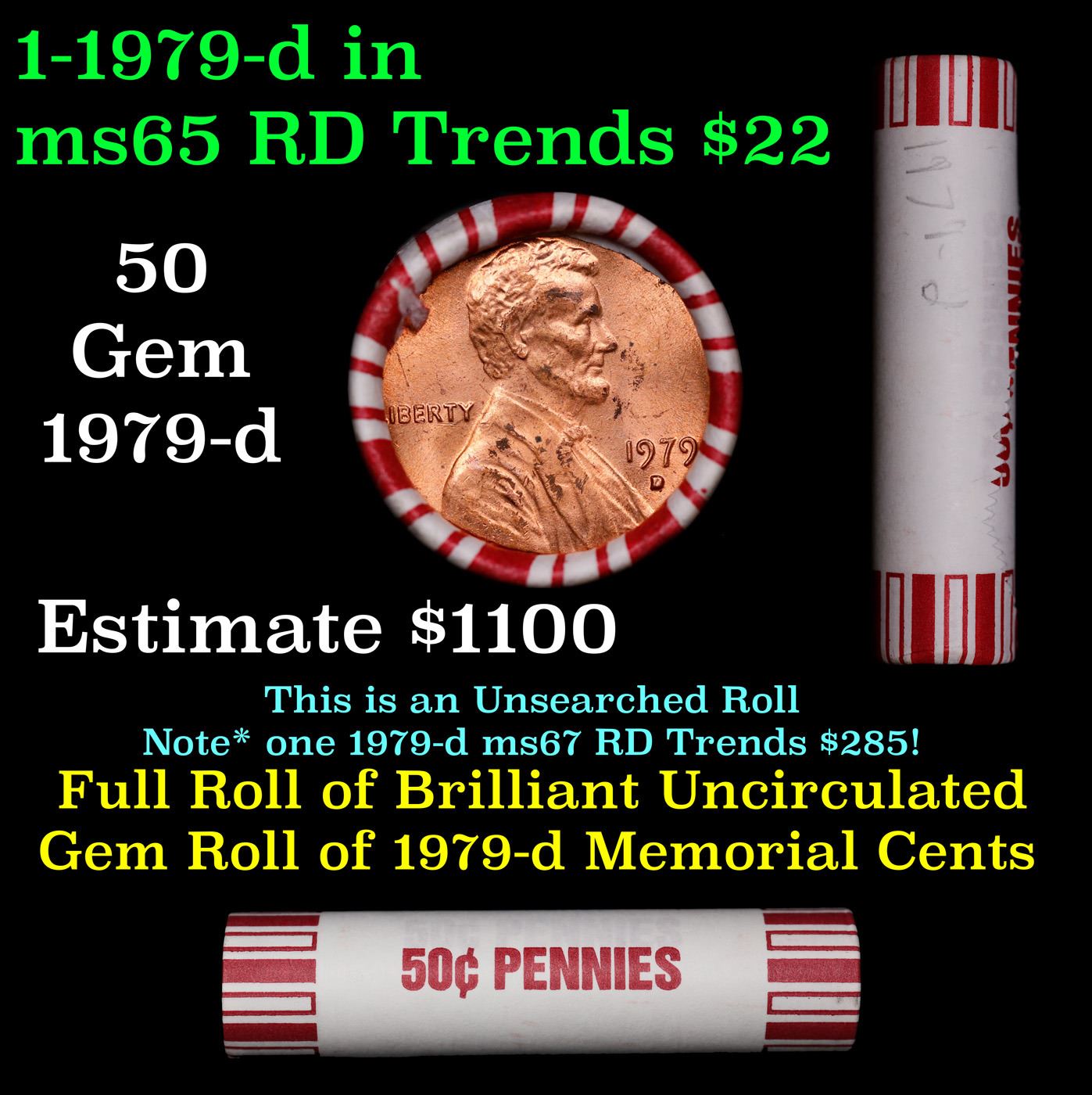 Shotgun Lincoln 1c roll, 1979-d 50 pcs Brandt 50c Wrapper.