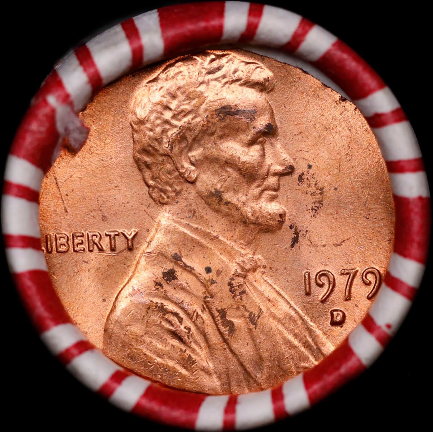 Shotgun Lincoln 1c roll, 1979-d 50 pcs Brandt 50c Wrapper.. A terrific Shotgun roll of Lincoln cents. Most if not all coin should be cherry red.