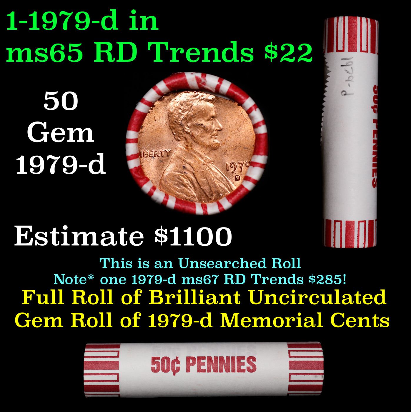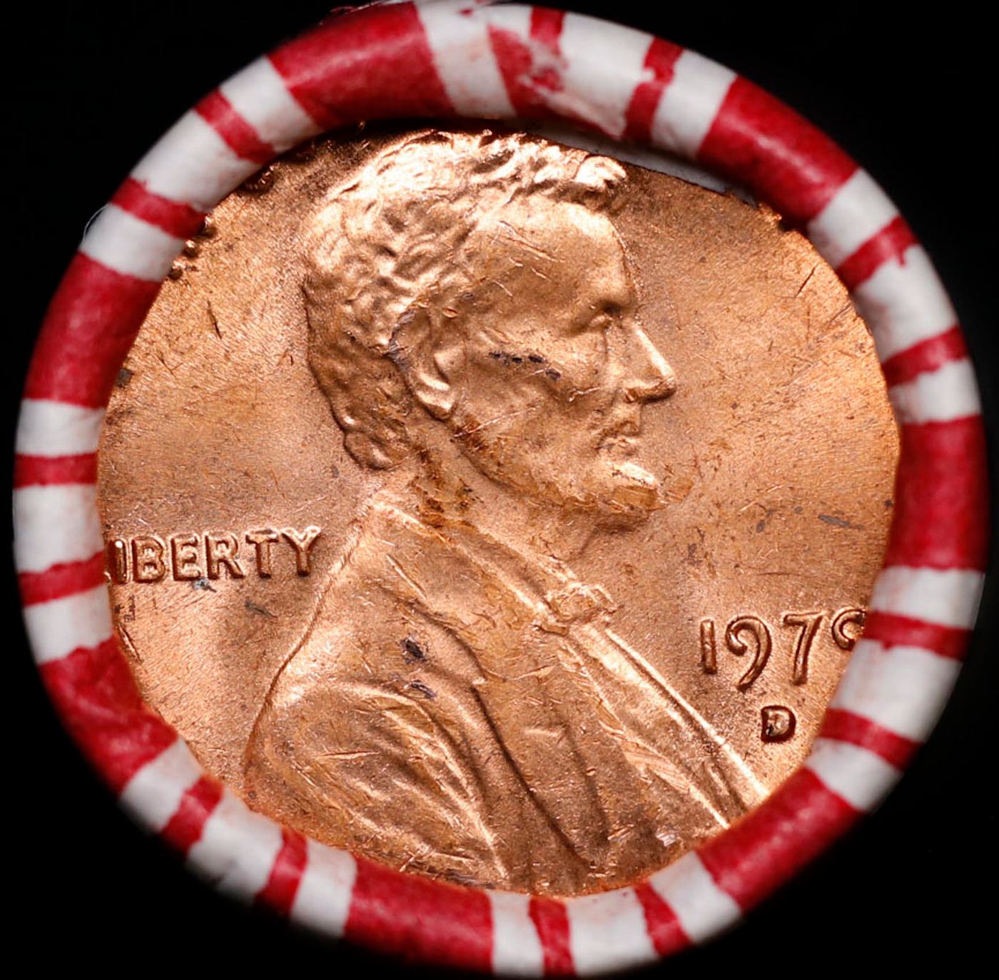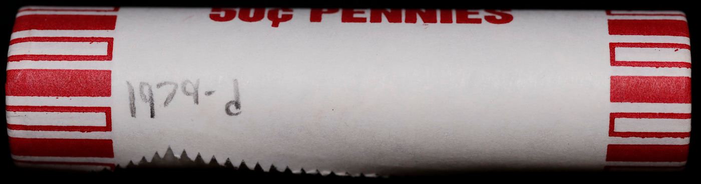 Shotgun Lincoln 1c roll, 1979-d 50 pcs Brandt 50c Wrapper.. A terrific Shotgun roll of Lincoln cents. Most if not all coin should be cherry red.