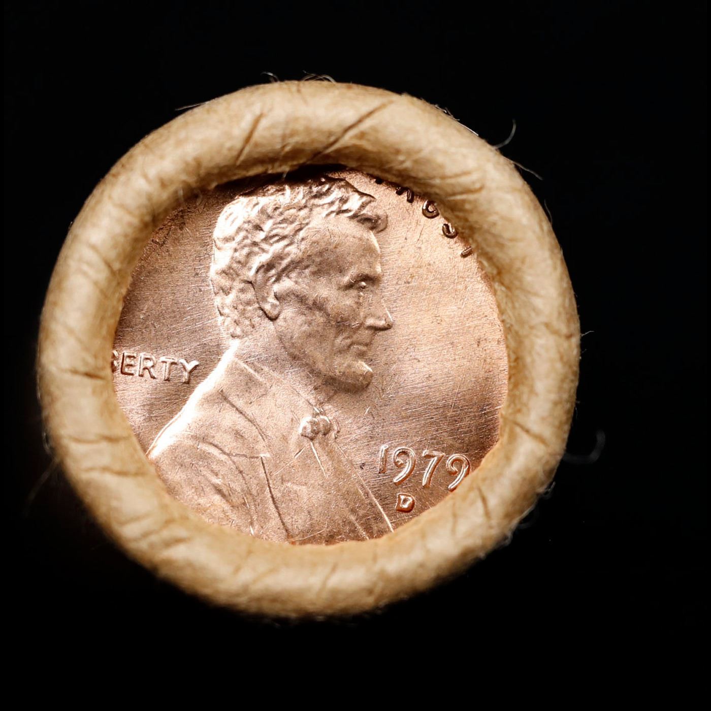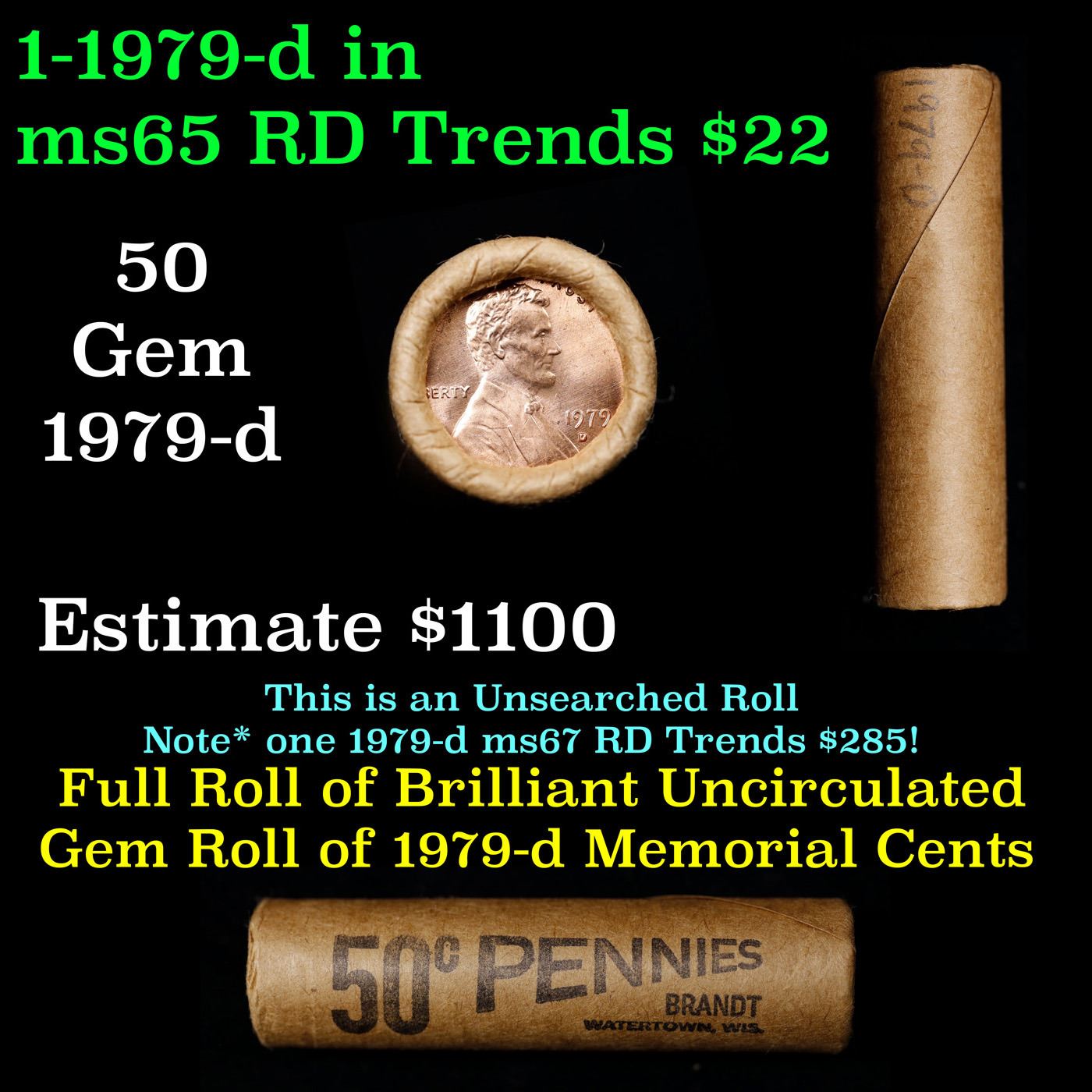 Shotgun Lincoln 1c roll, 1979-d 50 pcs Brandt Wrapper . A terrific Shotgun roll of Lincoln cents. All coins appear to be cherry red. Trends ms65 rd $22