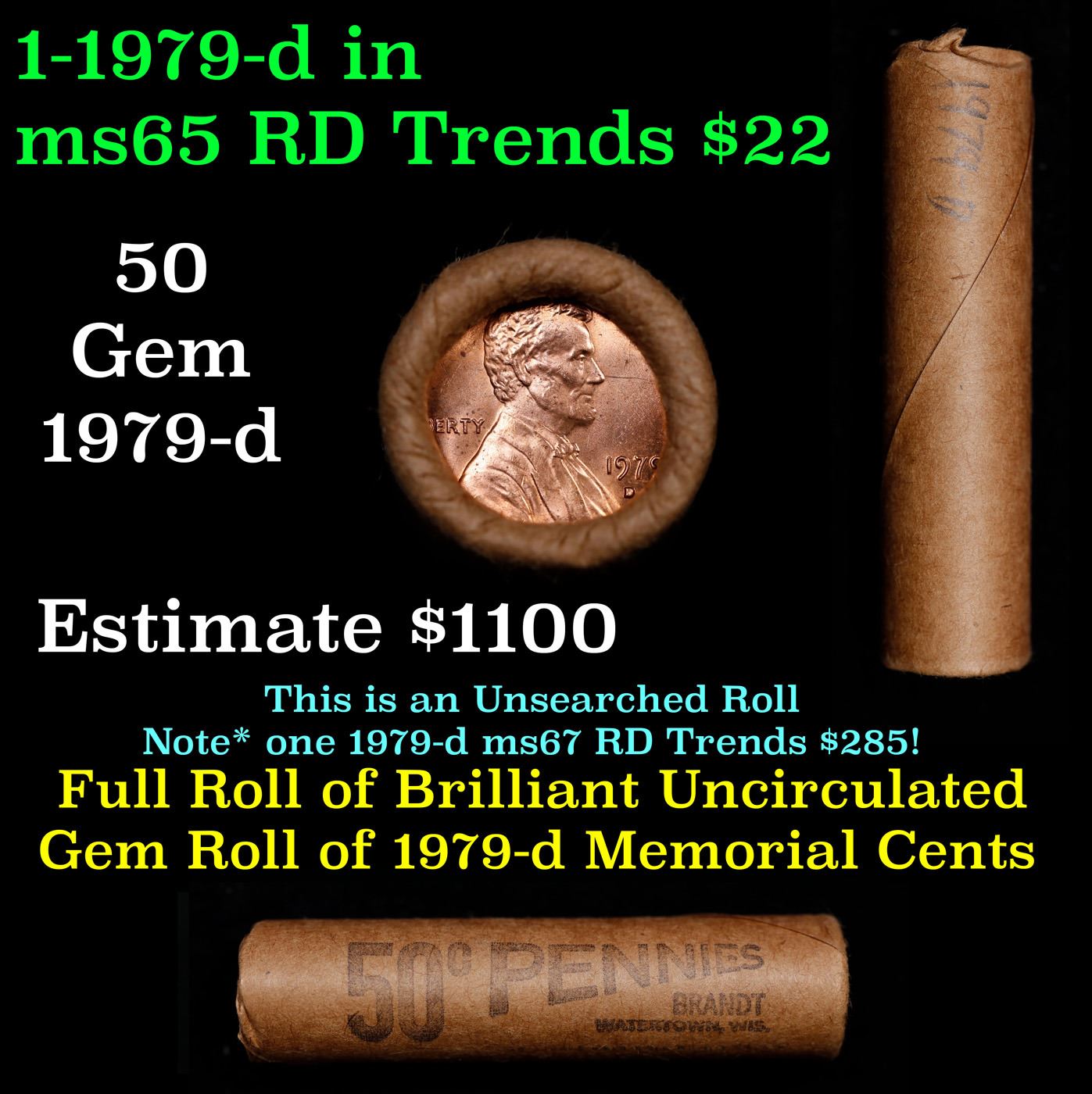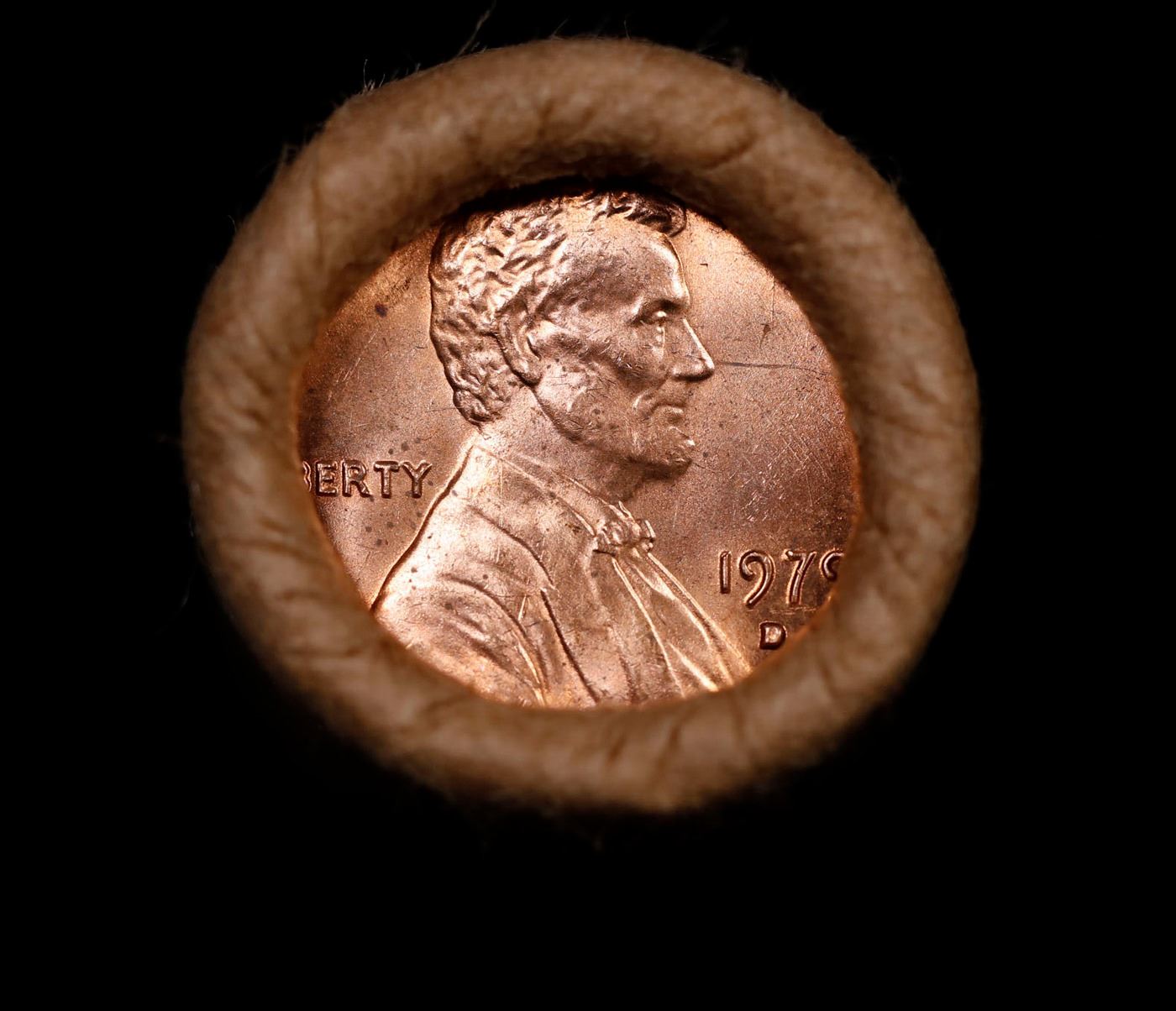 Shotgun Lincoln 1c roll, 1979-d 50 pcs Brandt Wrapper.. A terrific Shotgun roll of Lincoln cents. Most if not all coin should be cherry red.