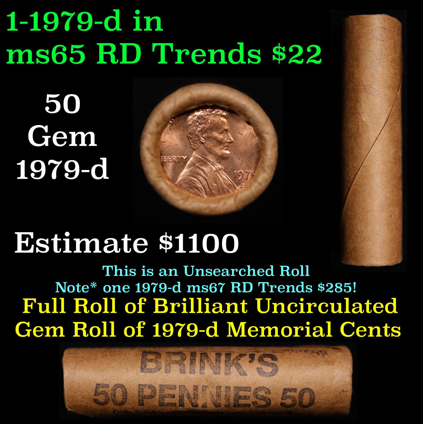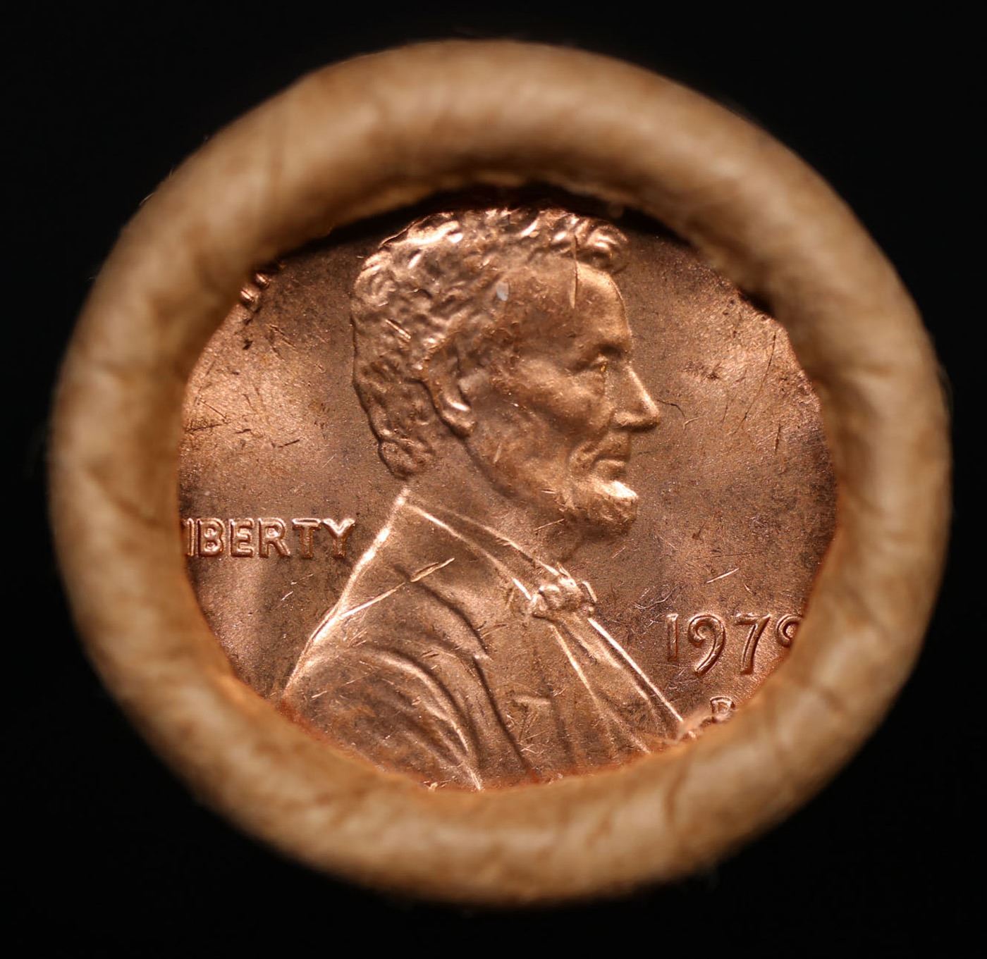 Shotgun Lincoln 1c roll, 1979-d 50 pcs Brinks Wrapper.. A terrific Shotgun roll of Lincoln cents. All coins appear to be cherry red. Trends ms65 rd $22