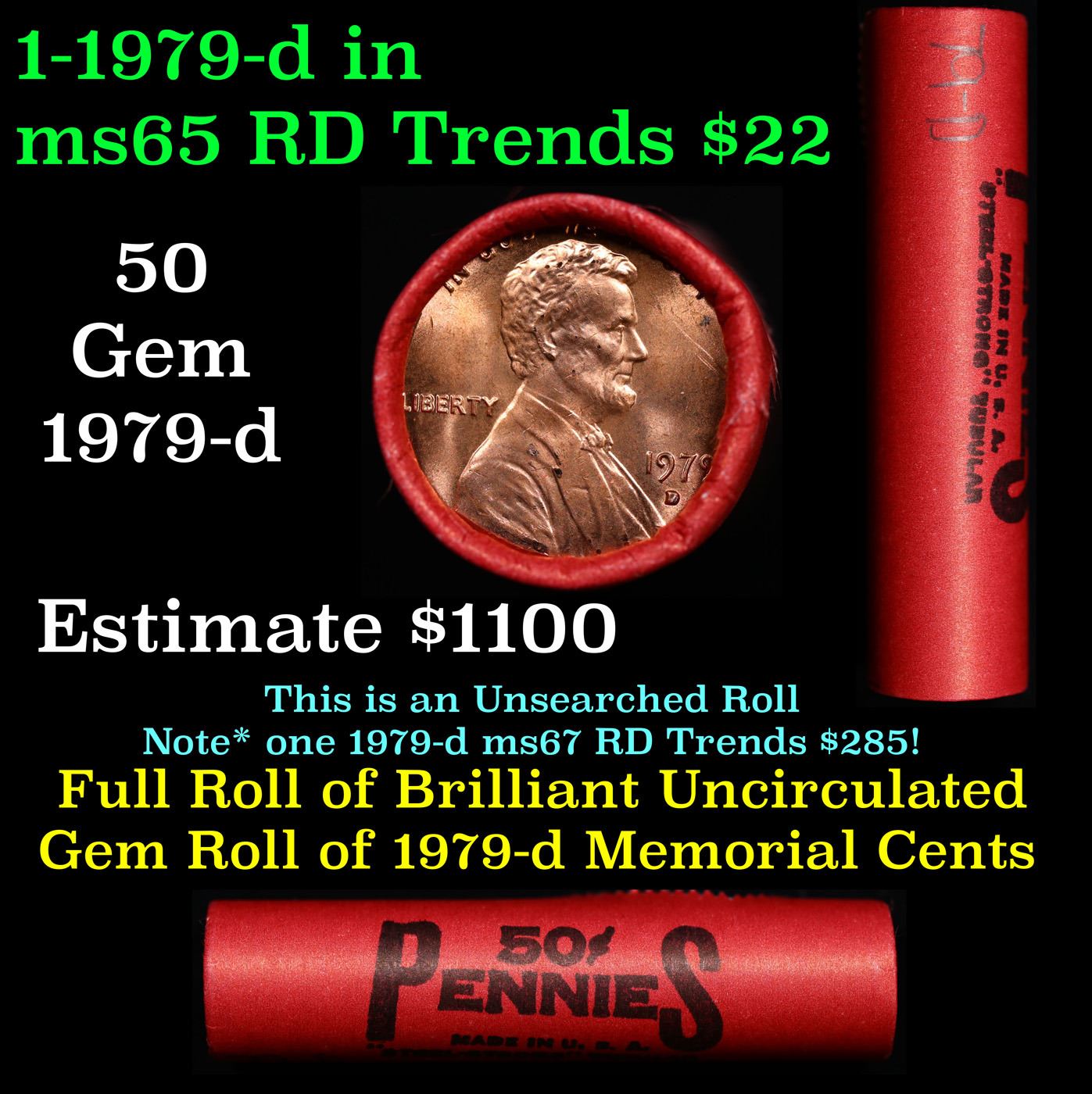 Shotgun Lincoln 1c roll, 1979-d 50 pcs Steel Strong Wrapper.. A terrific Shotgun roll of Lincoln cents. Most if not all coin should be cherry red.