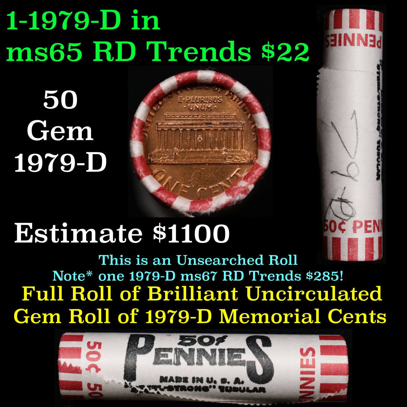 Shotgun Lincoln 1c roll, 1979-d 50 pcs Steel Strong Wrapper.. A terrific Shotgun roll of Lincoln cents. Most if not all coin should be cherry red.