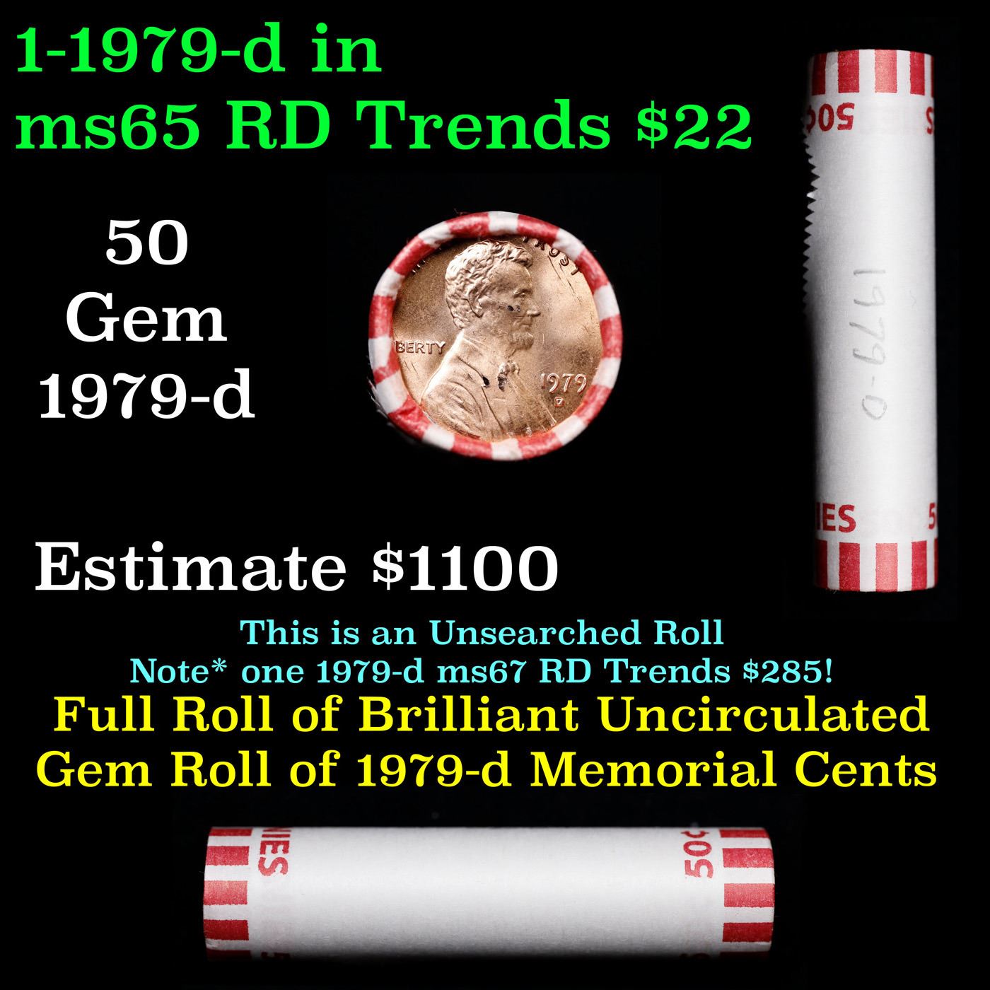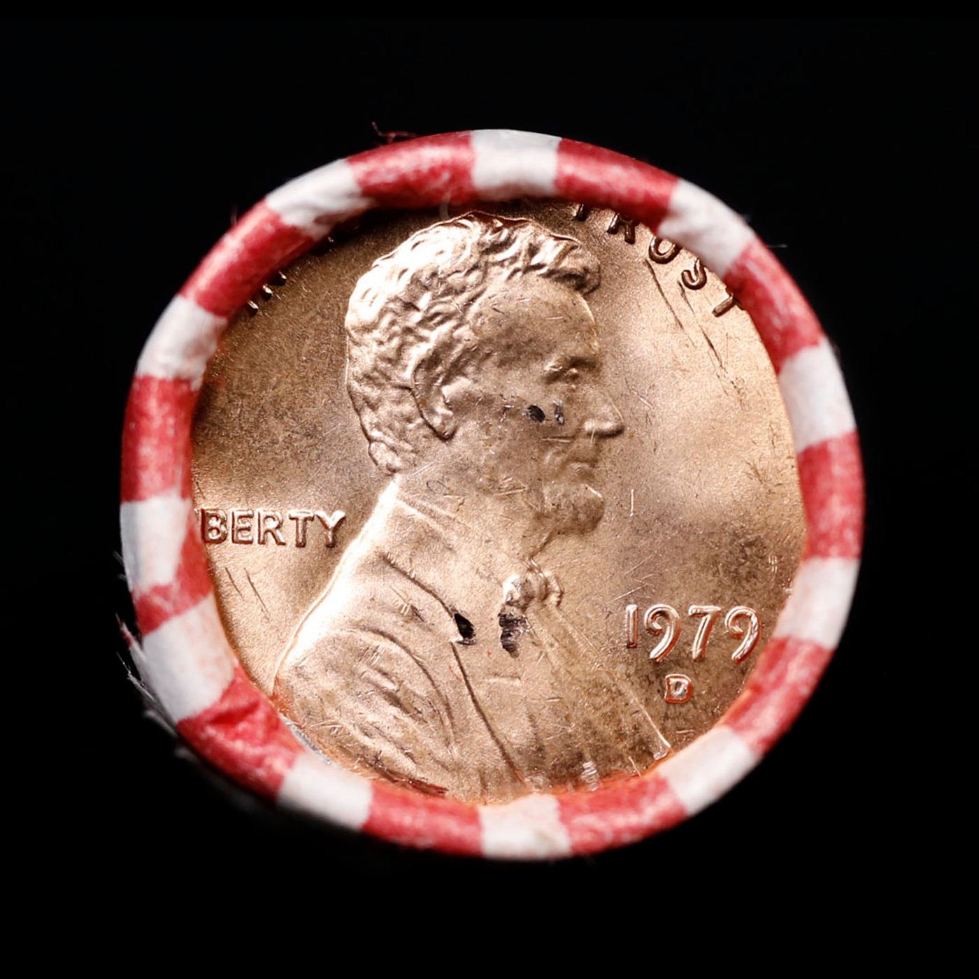 Shotgun Lincoln 1c roll, 1979-d 50 pcs Wrapper . A terrific Shotgun roll of Lincoln cents. All coins appear to be cherry red. Trends ms65 rd $22