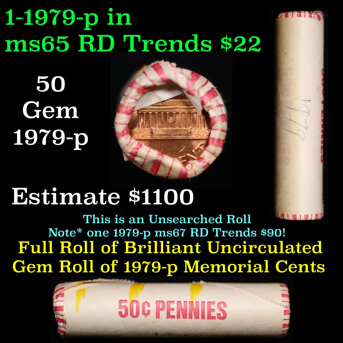 Shotgun Lincoln 1c roll, 1979-p 50 pcs Wrapper.. A terrific Shotgun roll of Lincoln cents. All coins appear to be cherry red. Trends ms65 rd $22