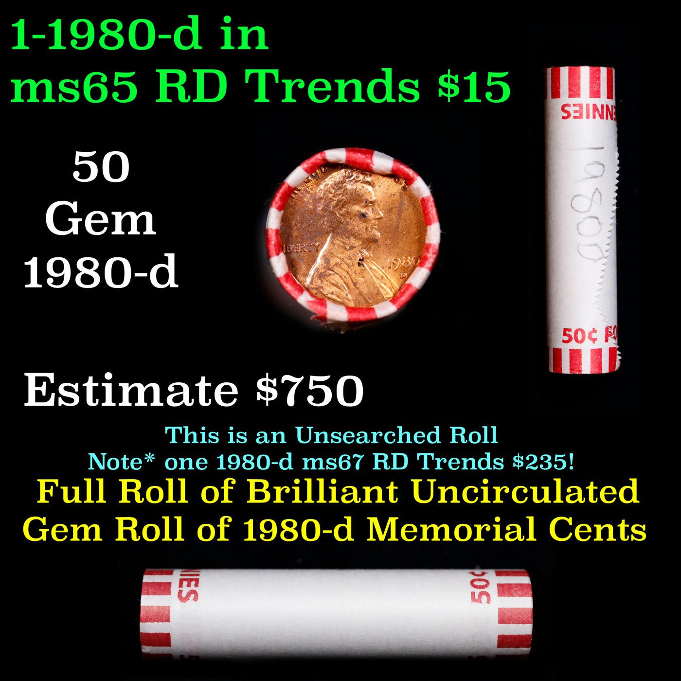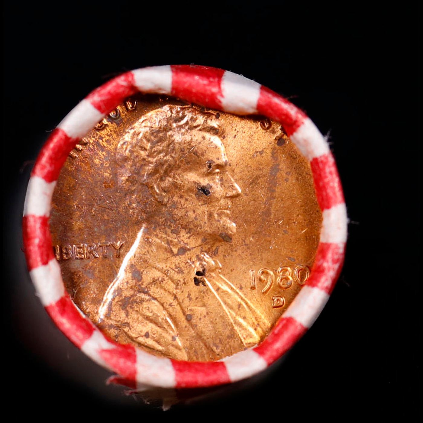 Shotgun Lincoln 1c roll, 1980-d 50 pcs Bank Wrapper.. A terrific Shotgun roll of Lincoln cents. Most if not all coin should be cherry red.