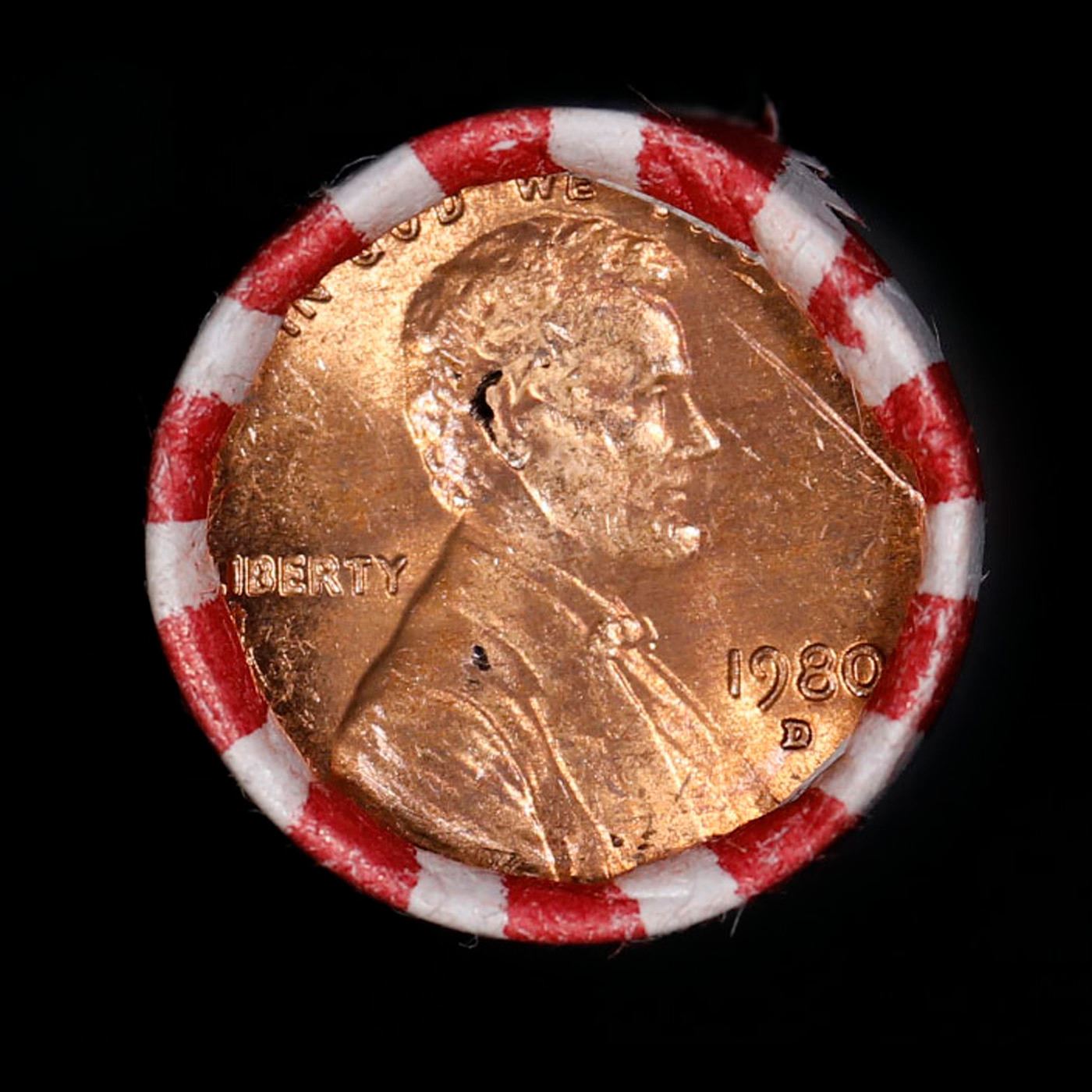 Shotgun Lincoln 1c roll, 1980-d 50 pcs Bank Wrapper.. A terrific Shotgun roll of Lincoln cents. Most if not all coin should be cherry red.