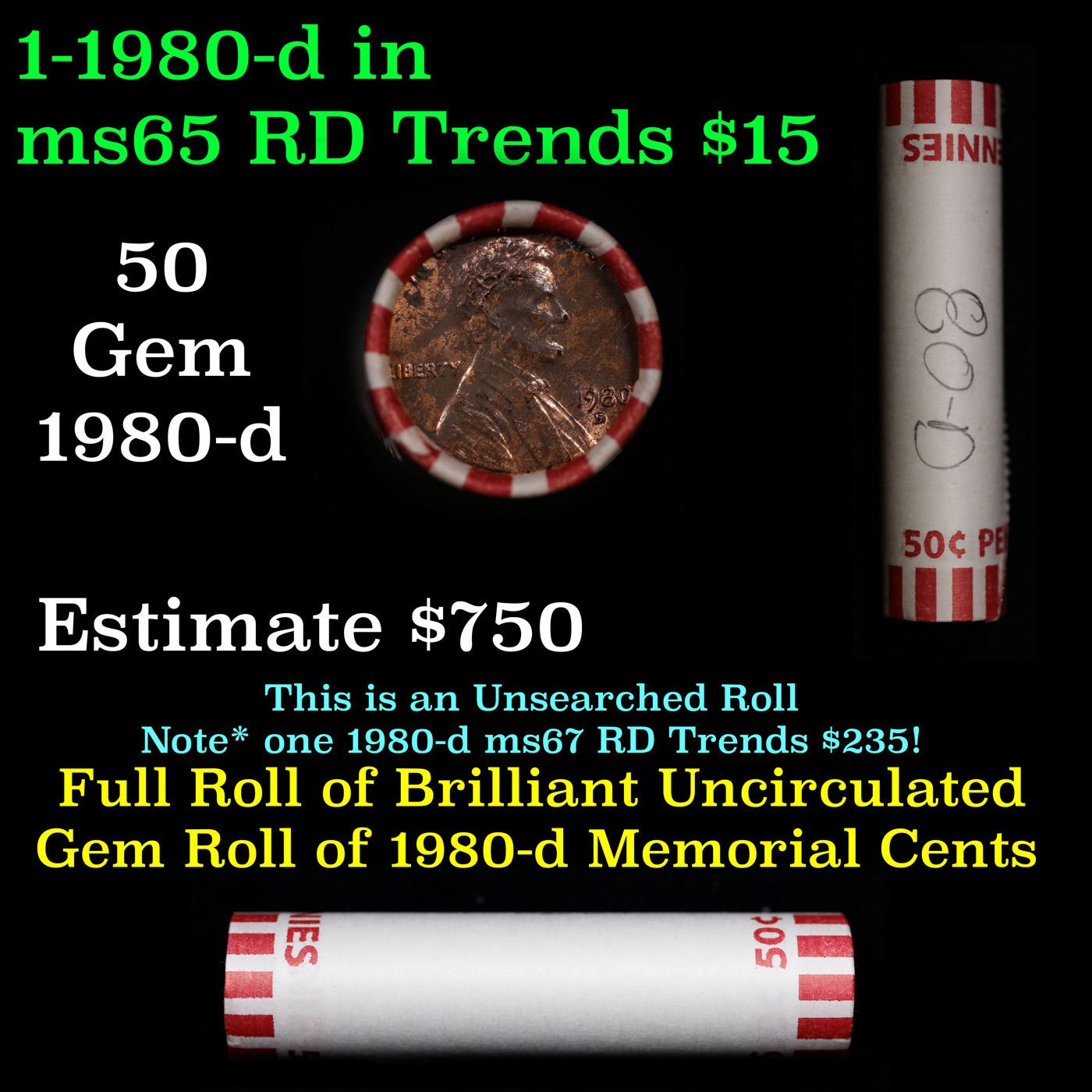 Shotgun Lincoln 1c roll, 1980-d 50 pcs Bank Wrapper.. A terrific Shotgun roll of Lincoln cents. Most if not all coin should be cherry red.
