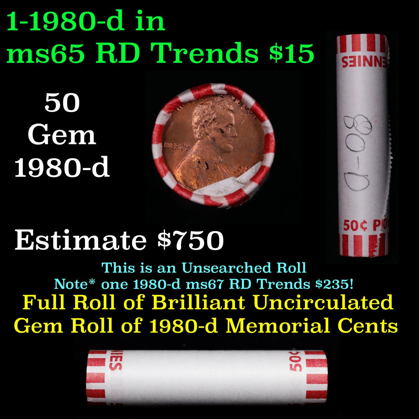 Shotgun Lincoln 1c roll, 1980-d 50 pcs Bank Wrapper.. A terrific Shotgun roll of Lincoln cents. Most if not all coin should be cherry red.