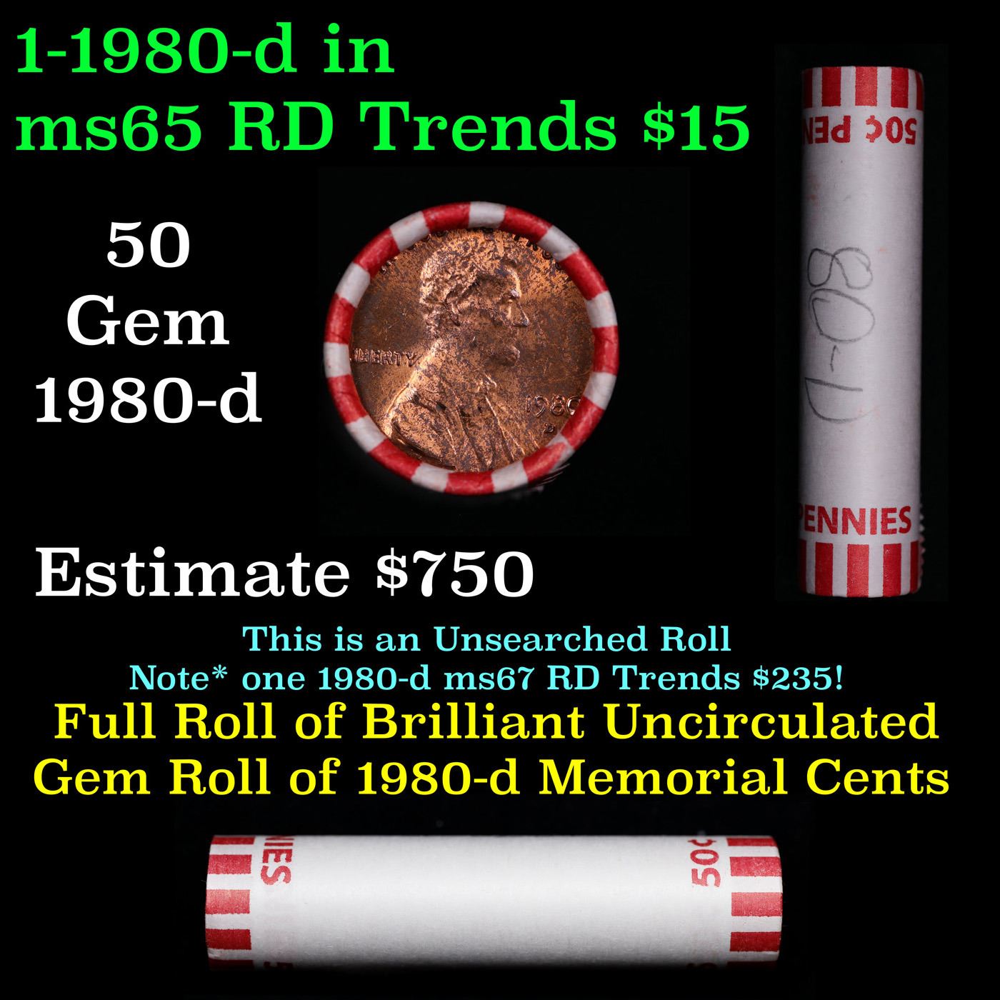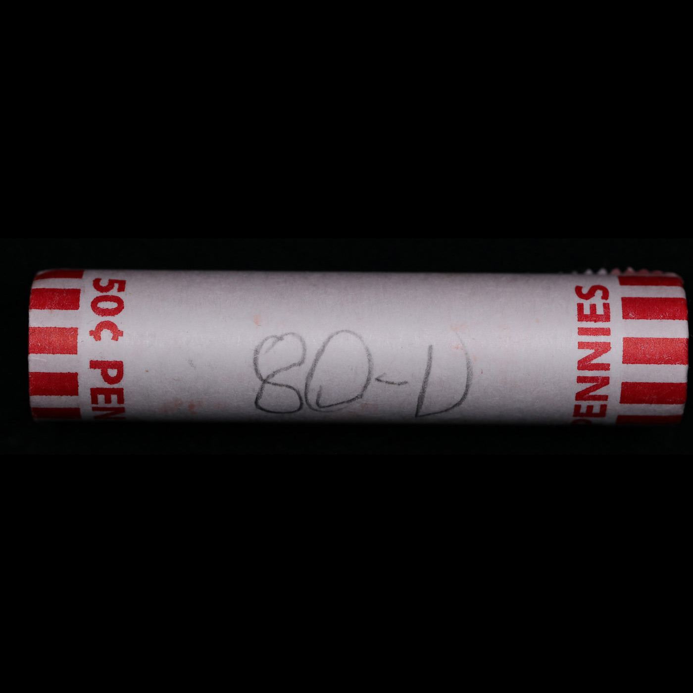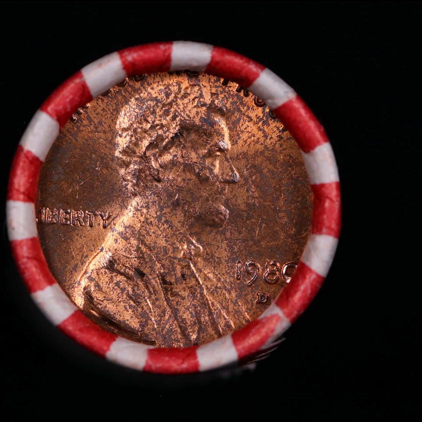 Shotgun Lincoln 1c roll, 1980-d 50 pcs Bank Wrapper.. A terrific Shotgun roll of Lincoln cents. Most if not all coin should be cherry red.