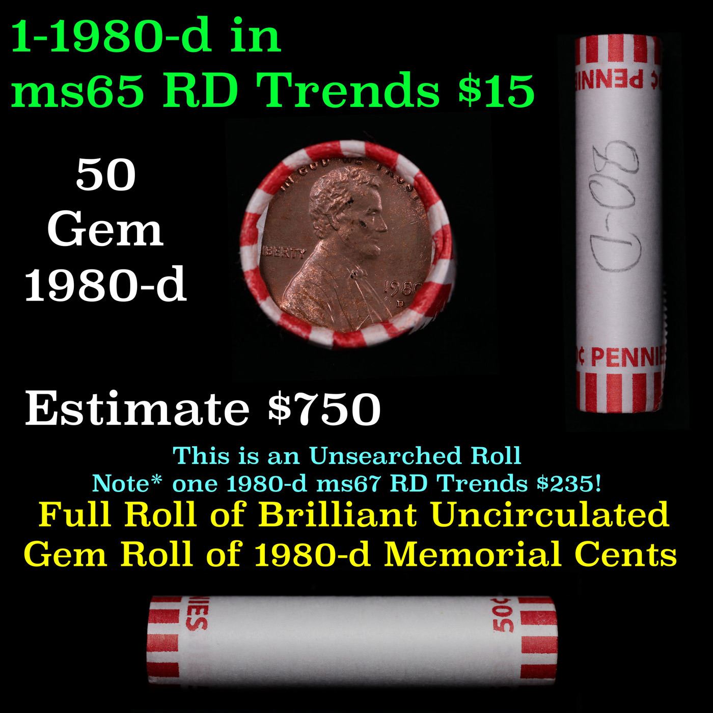 Shotgun Lincoln 1c roll, 1980-d 50 pcs Bank Wrapper.. A terrific Shotgun roll of Lincoln cents. Most if not all coin should be cherry red.