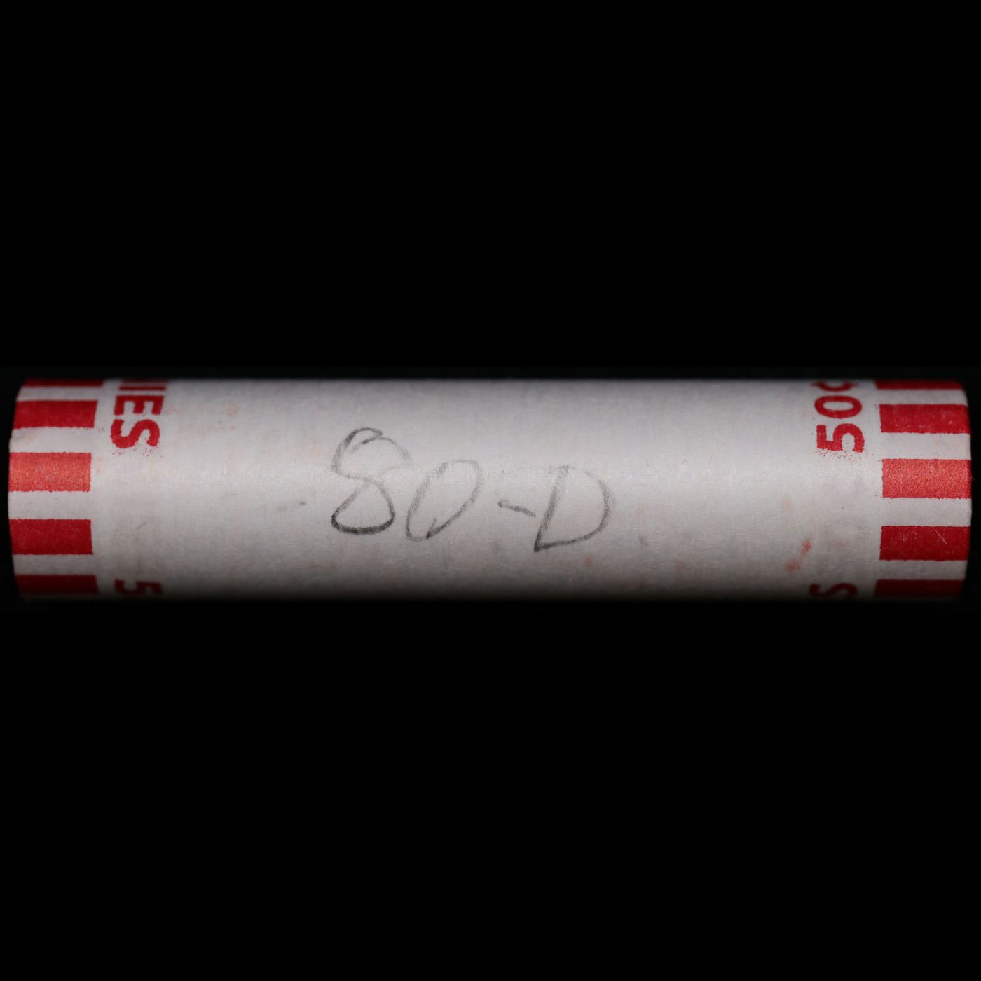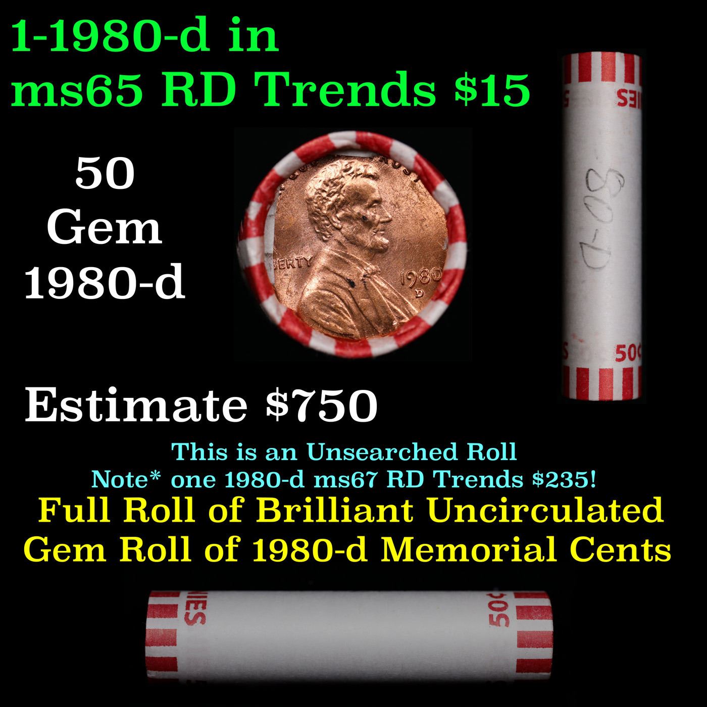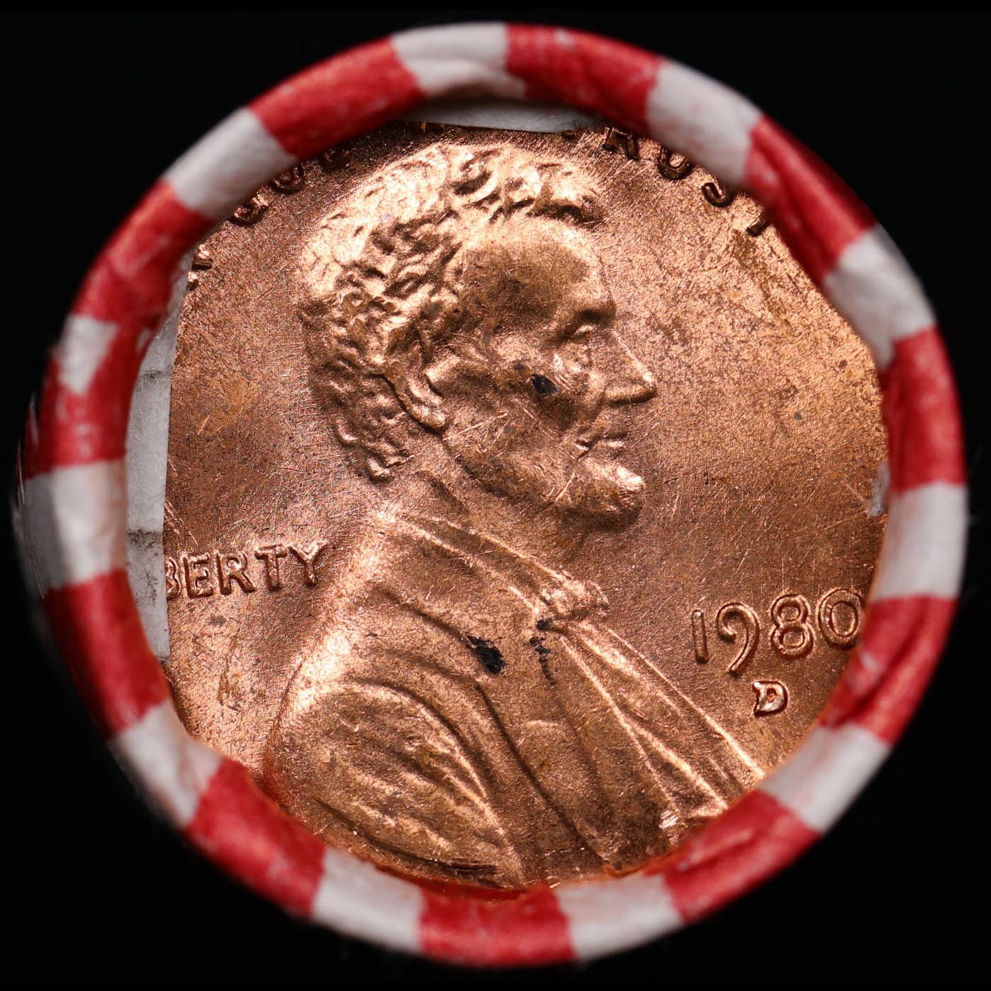Shotgun Lincoln 1c roll, 1980-d 50 pcs Bank Wrapper.. A terrific Shotgun roll of Lincoln cents. Most if not all coin should be cherry red.