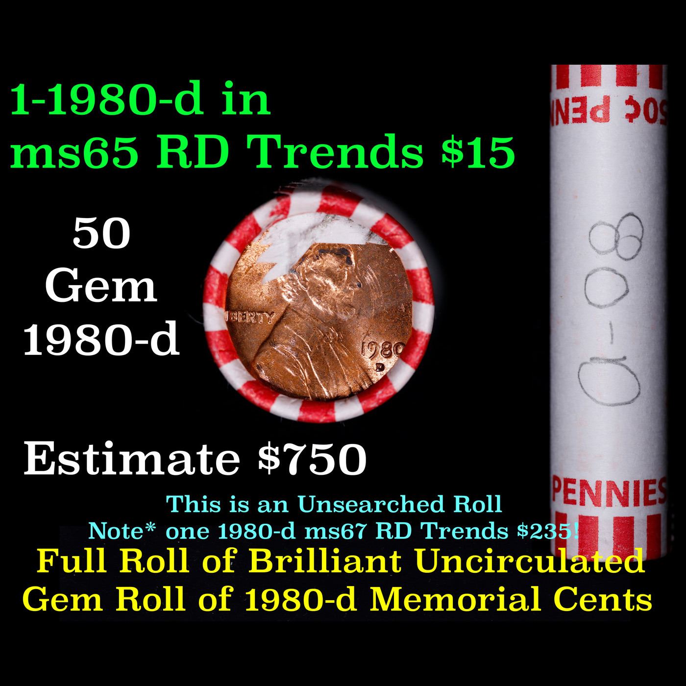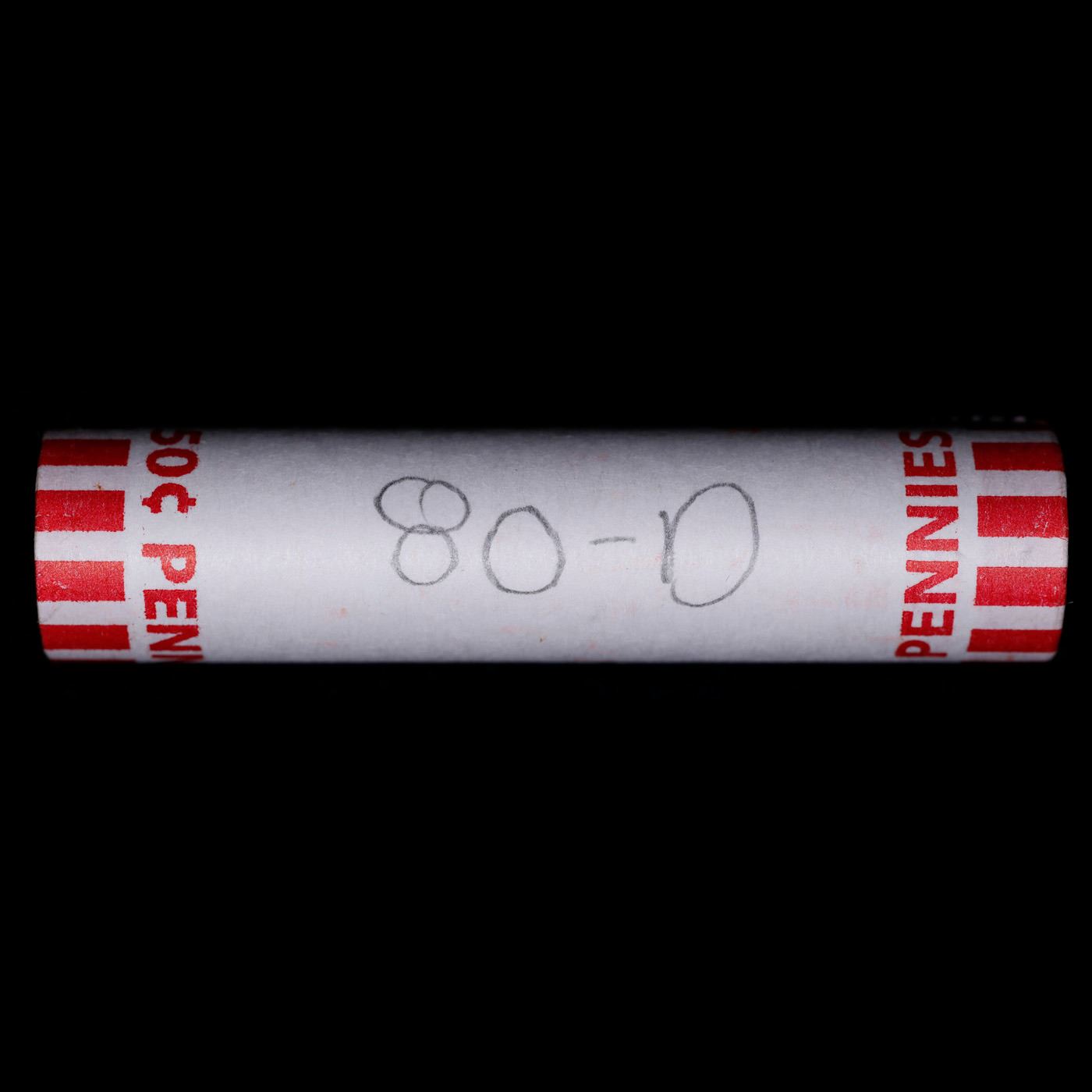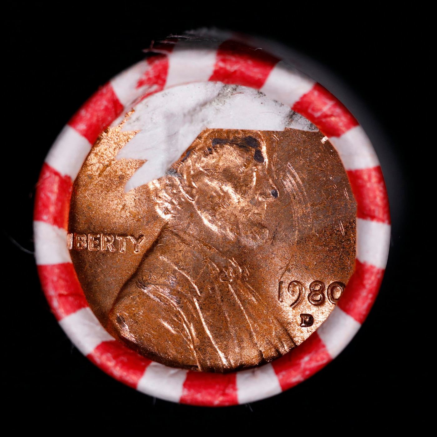 Shotgun Lincoln 1c roll, 1980-d 50 pcs Bank Wrapper.. A terrific Shotgun roll of Lincoln cents. Most if not all coin should be cherry red.