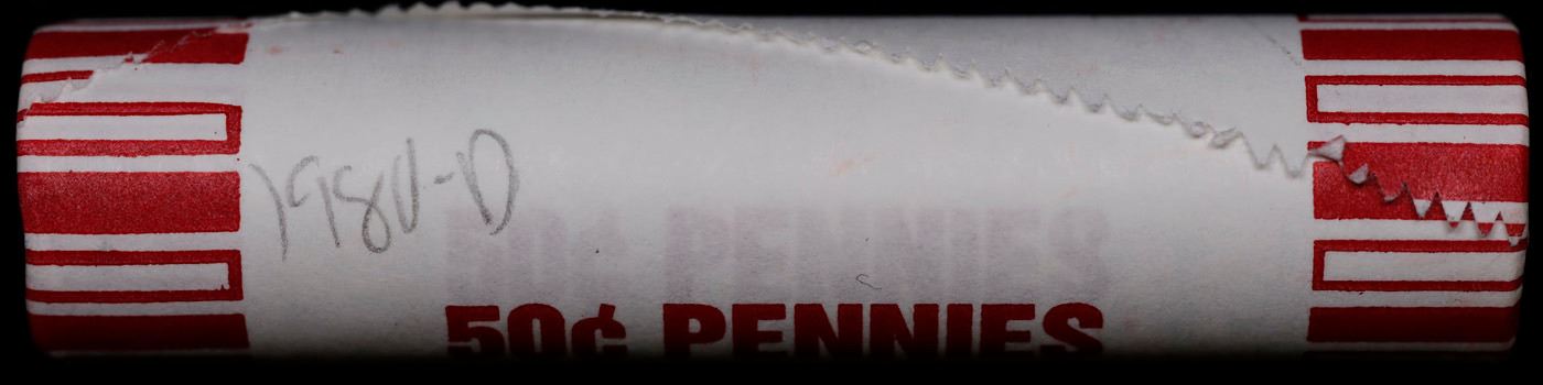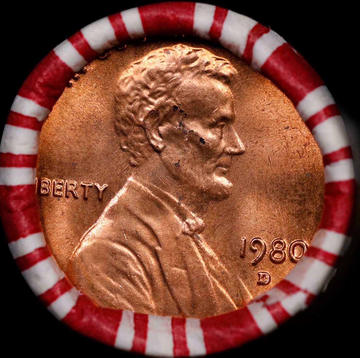 Shotgun Lincoln 1c roll, 1980-d 50 pcs Brandt 50c Wrapper.. A terrific Shotgun roll of Lincoln cents. Most if not all coin should be cherry red.