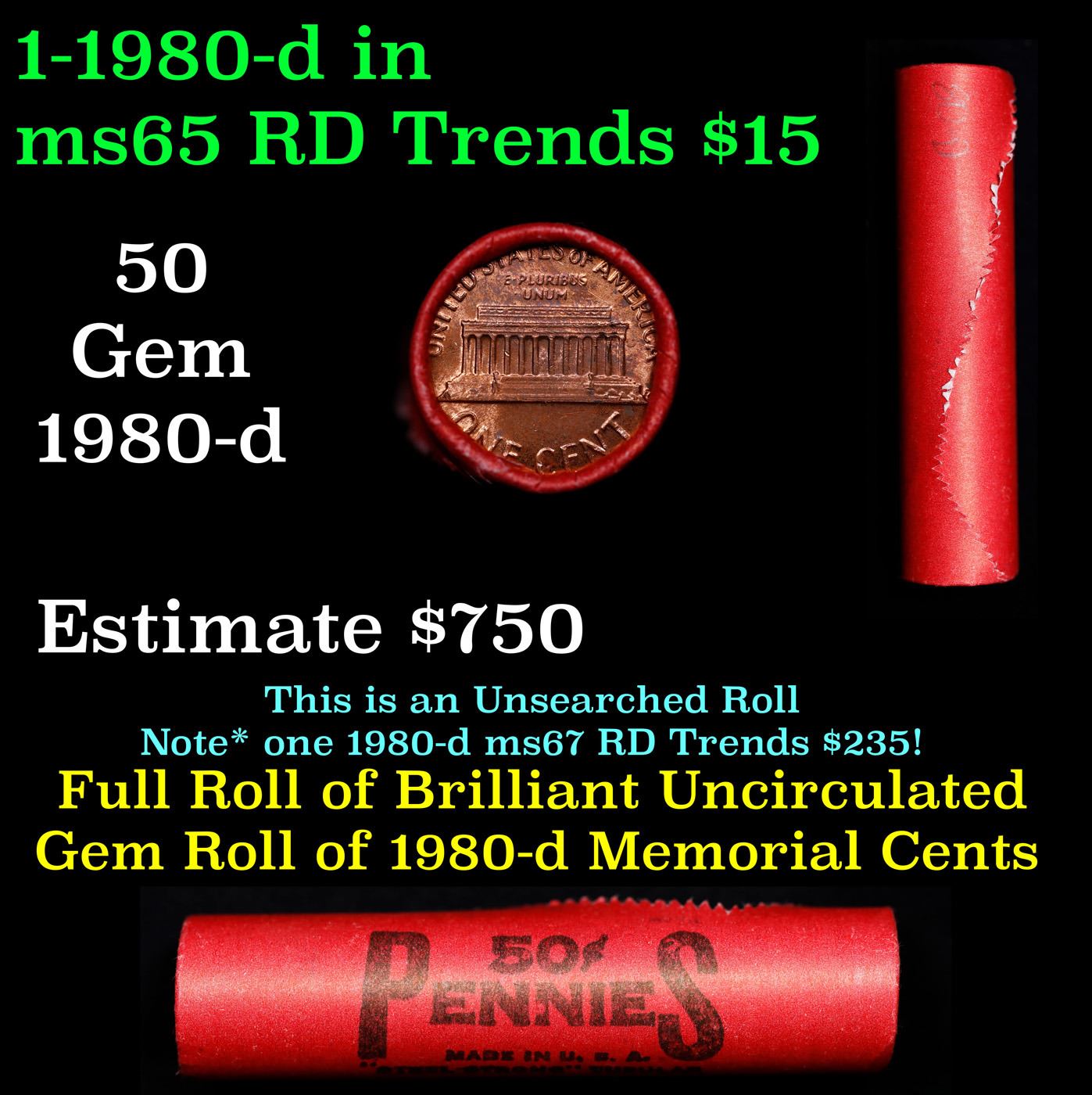 Shotgun Lincoln 1c roll, 1980-d 50 pcs Steel-Strong Wrapper.. A terrific Shotgun roll of Lincoln cents. Most if not all coin should be cherry red.