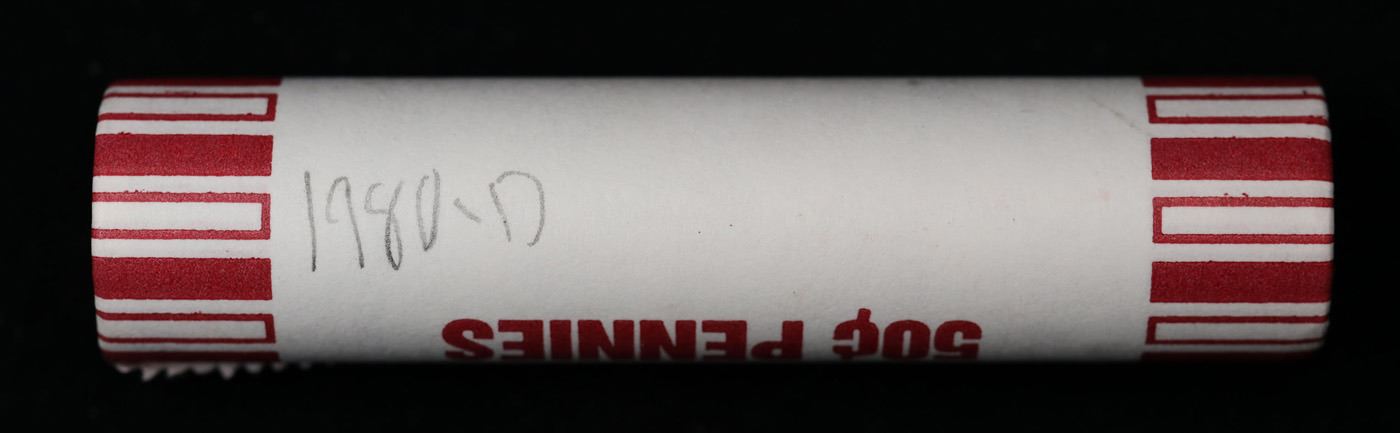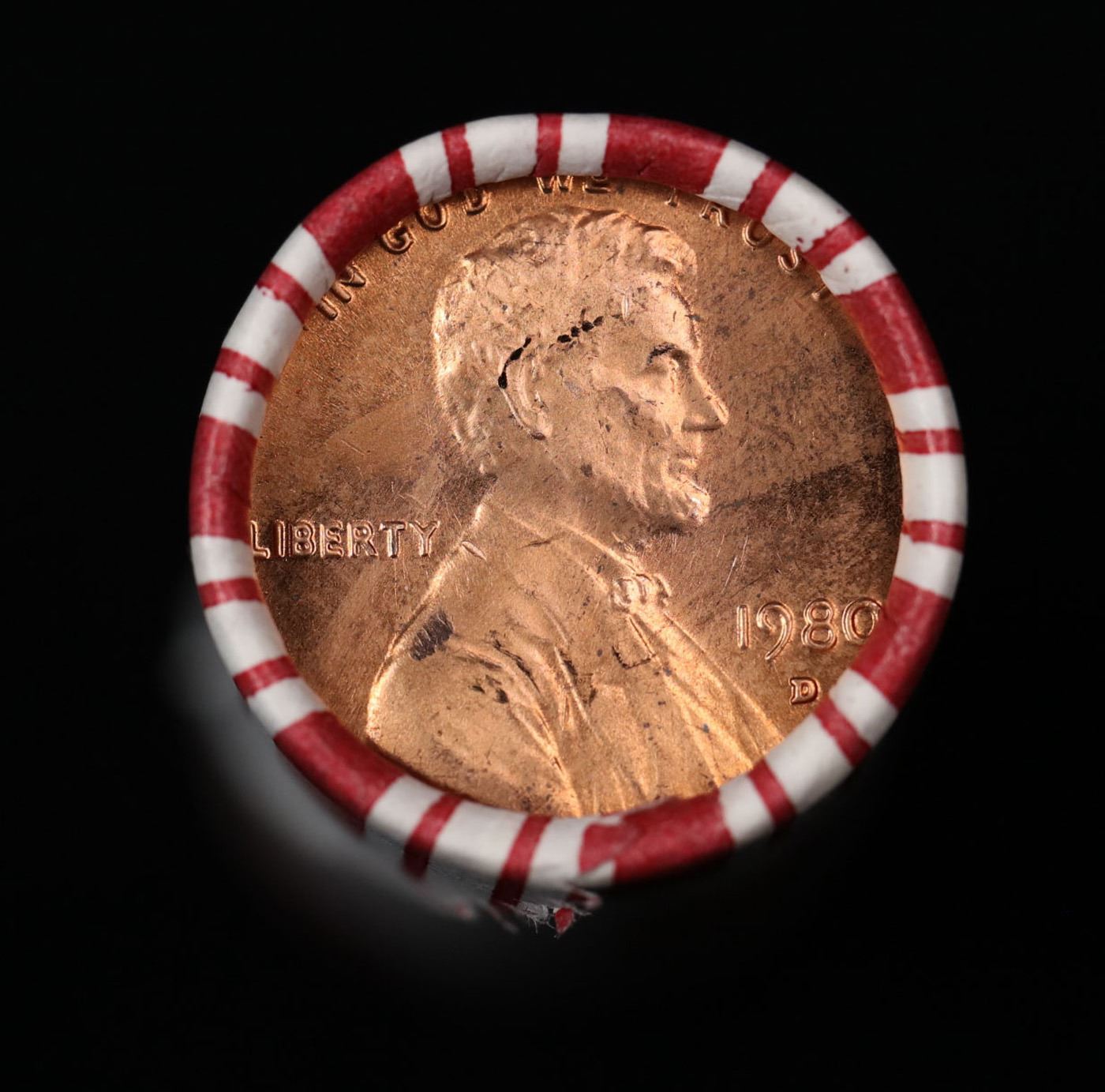 Shotgun Lincoln 1c roll, 1980-d 50 pcs Steel-Strong Wrapper.. A terrific Shotgun roll of Lincoln cents. Most if not all coin should be cherry red.