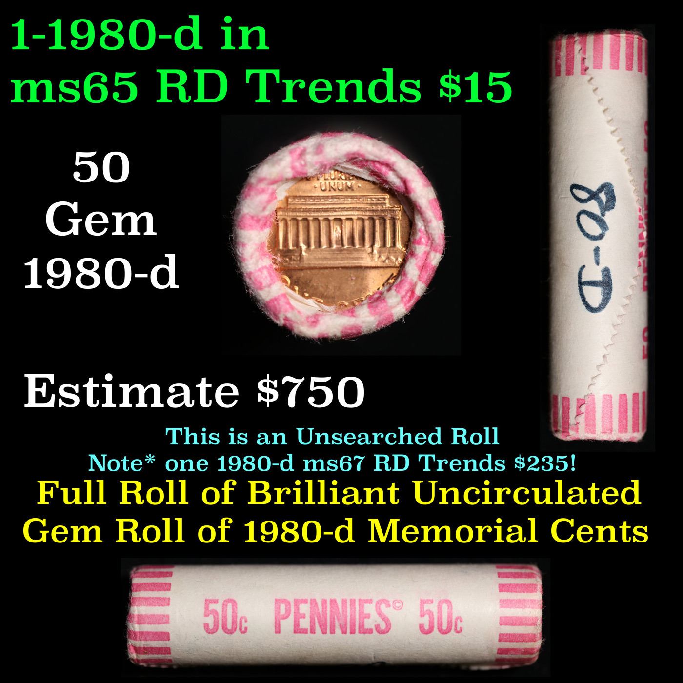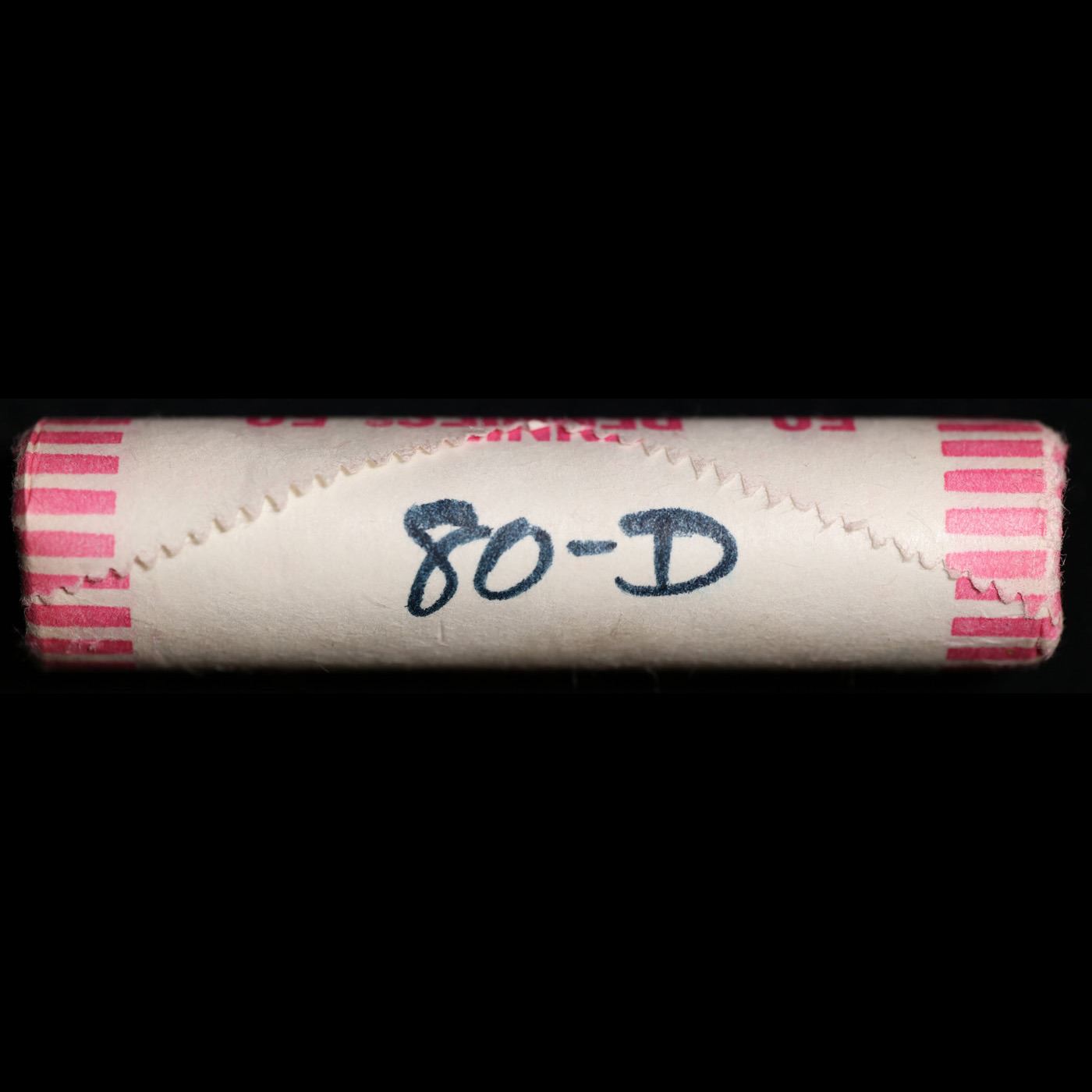 Shotgun Lincoln 1c roll, 1980-d 50 pcs Wrapper.. A terrific Shotgun roll of Lincoln cents. All coins appear to be cherry red. Trends ms65 rd $15