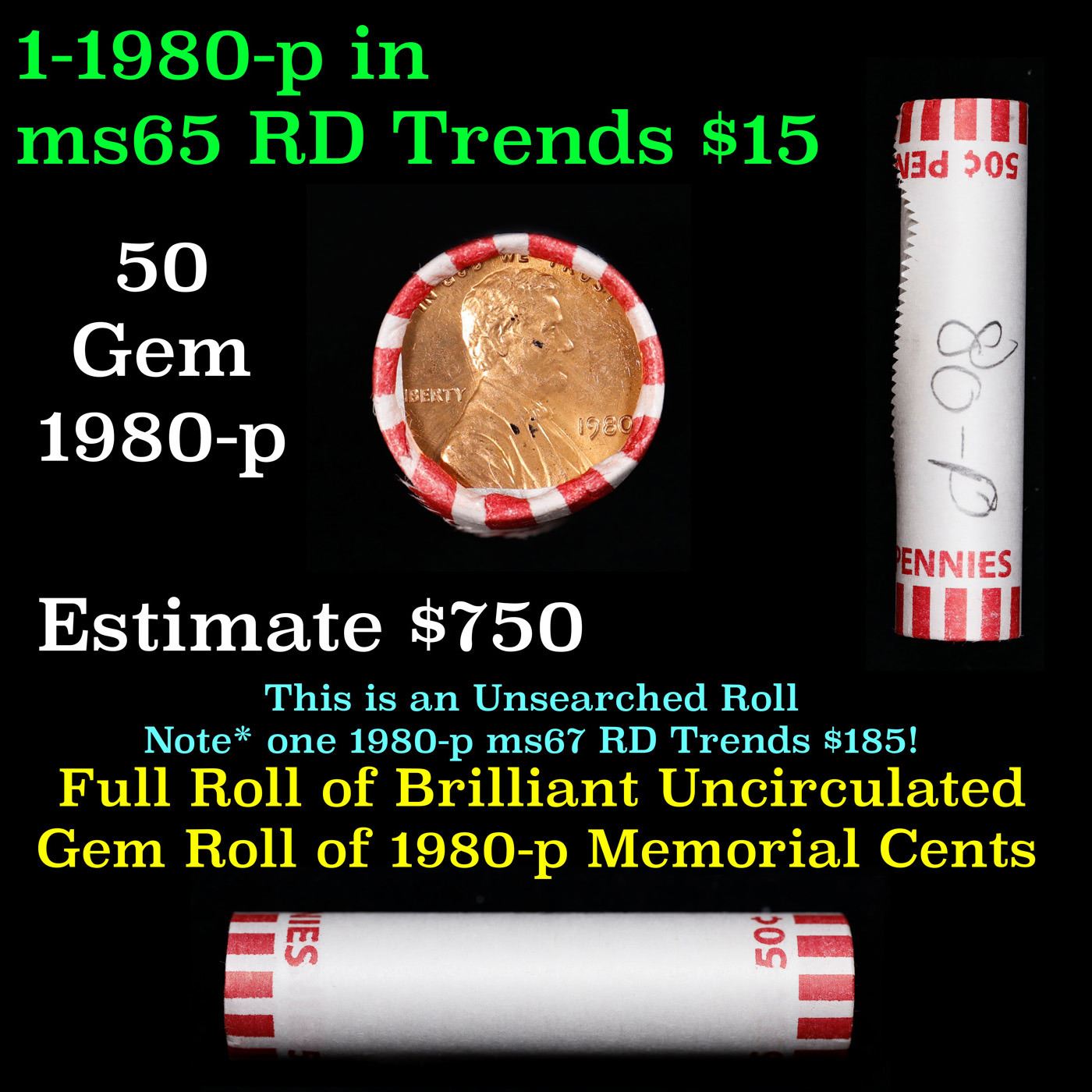 Shotgun Lincoln 1c roll, 1980-p 50 pcs Bank Wrapper.. A terrific Shotgun roll of Lincoln cents. Most if not all coin should be cherry red.