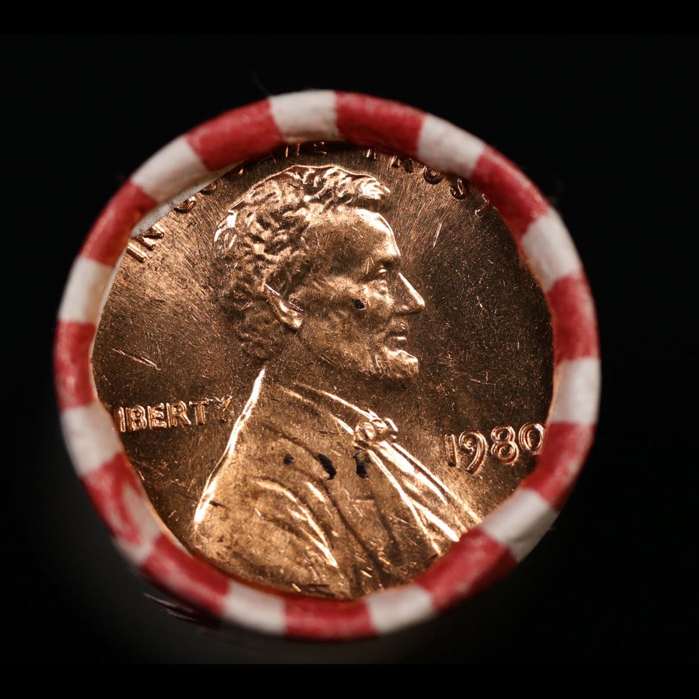 Shotgun Lincoln 1c roll, 1980-p 50 pcs Bank Wrapper.. A terrific Shotgun roll of Lincoln cents. Most if not all coin should be cherry red.