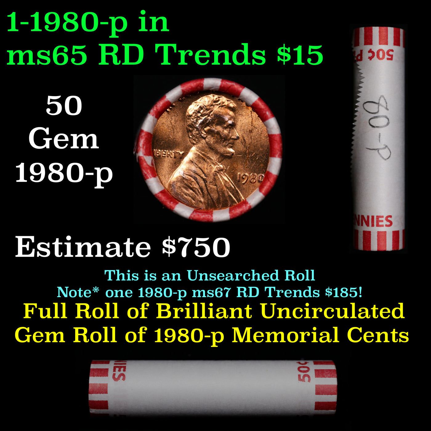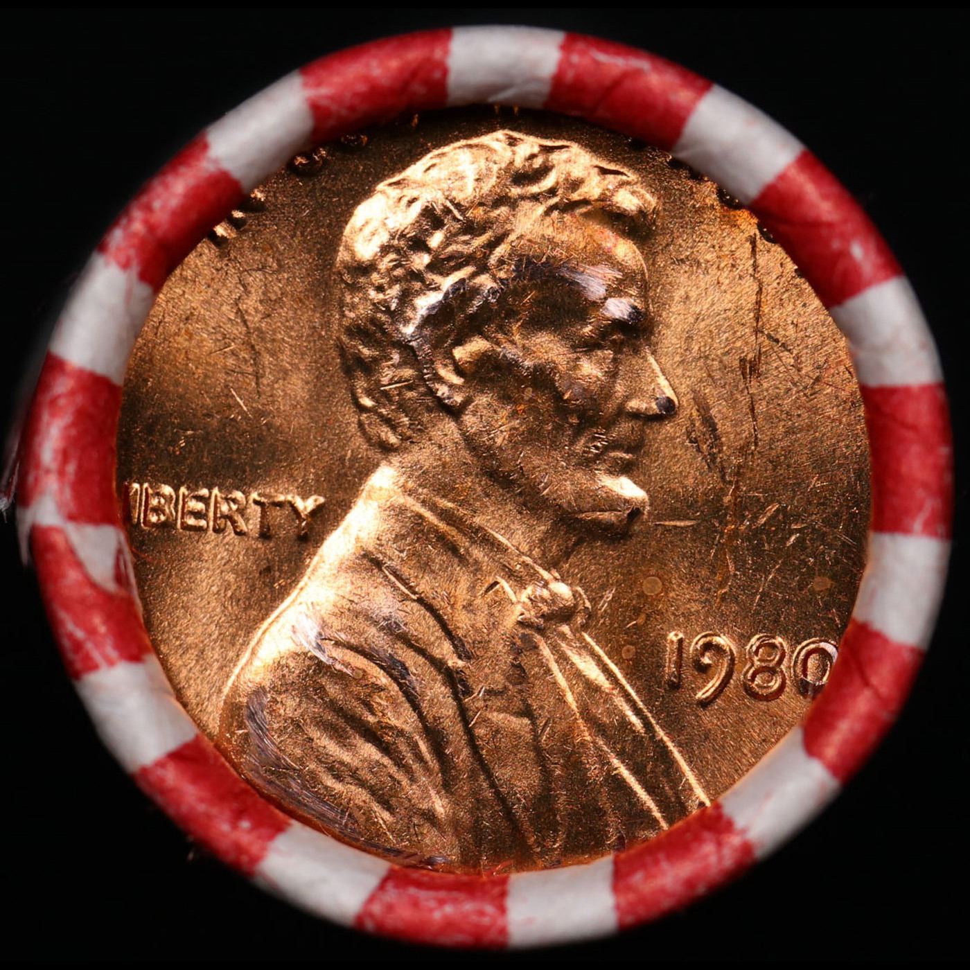 Shotgun Lincoln 1c roll, 1980-p 50 pcs Bank Wrapper.. A terrific Shotgun roll of Lincoln cents. Most if not all coin should be cherry red.