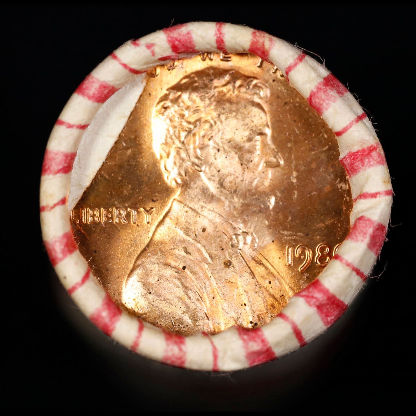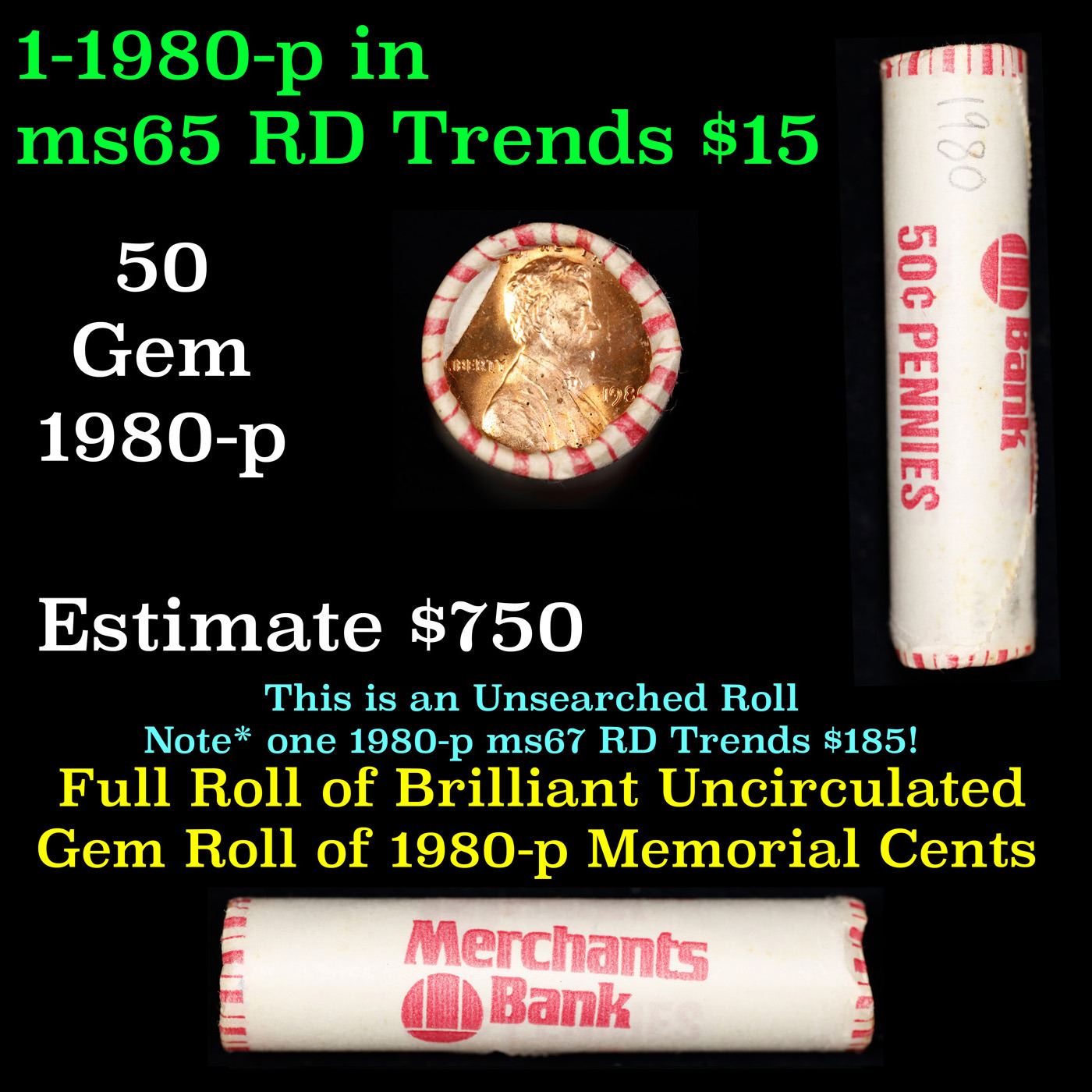 Shotgun Lincoln 1c roll, 1980-p 50 pcs Merchant Bank Wrapper.. A terrific Shotgun roll of Lincoln cents. Most if not all coin should be cherry red. Trends ms65 rd $15