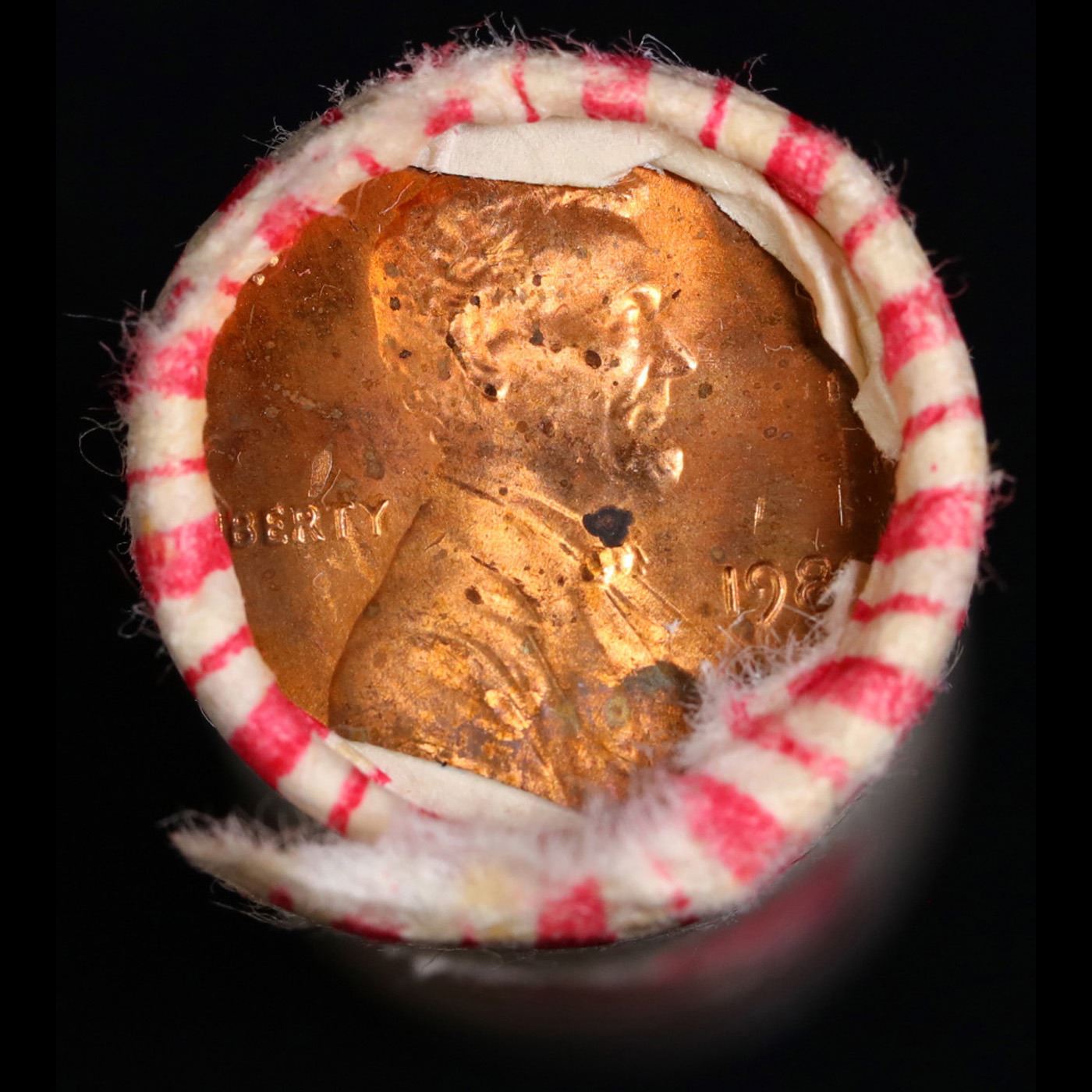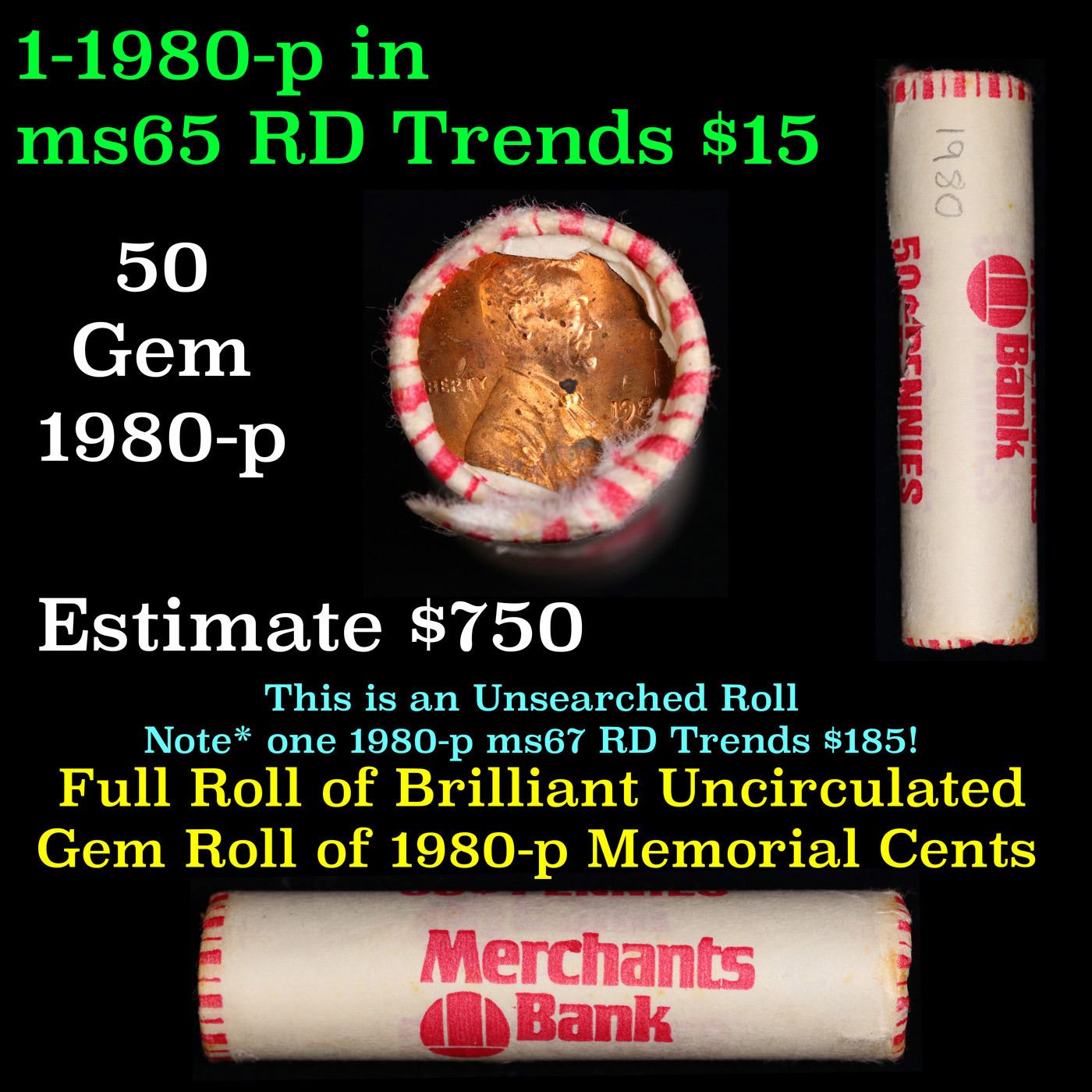 Shotgun Lincoln 1c roll, 1980-p 50 pcs Merchants Bank Wrapper.. A terrific Shotgun roll of Lincoln cents. Most if not all coin should be cherry red. Trends ms65 rd $15