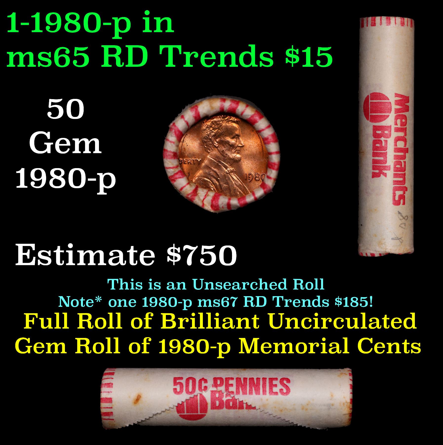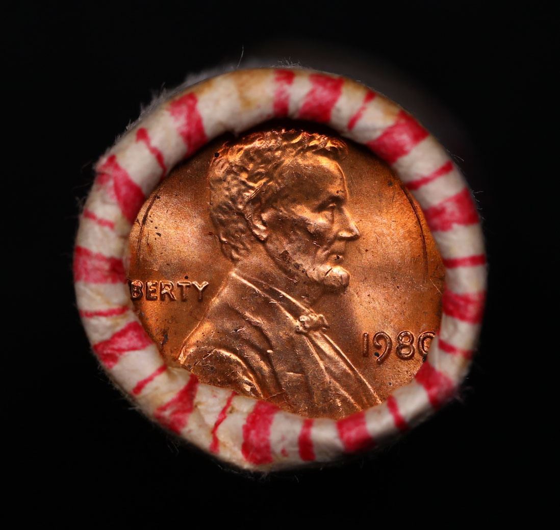 Shotgun Lincoln 1c roll, 1980-p 50 pcs Merchants Bank Wrapper.. A terrific Shotgun roll of Lincoln cents. Most if not all coin should be cherry red.