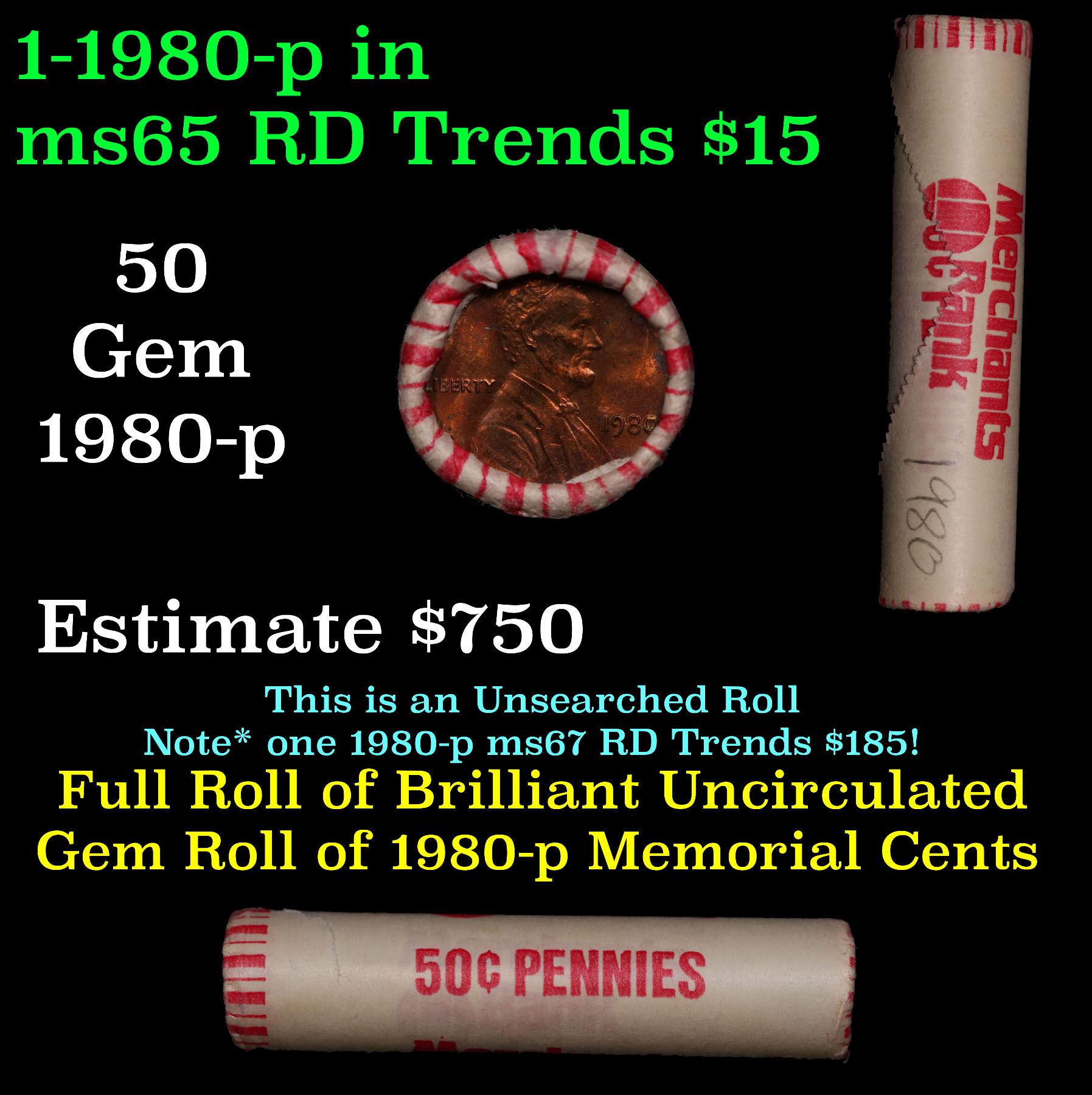 Shotgun Lincoln 1c roll, 1980-p 50 pcs Merchants Bank Wrapper.. A terrific Shotgun roll of Lincoln cents. Most if not all coin should be cherry red.
