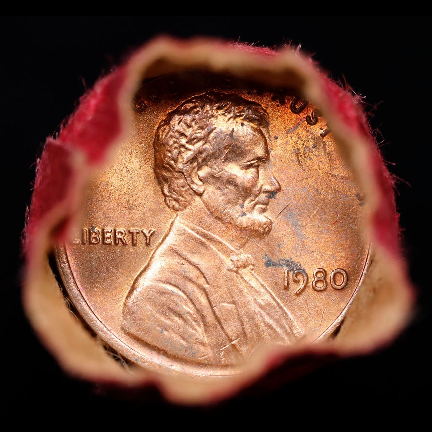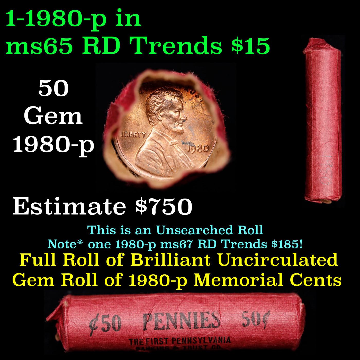 Shotgun Lincoln 1c roll, 1980-p 50 pcs The First Pennsylvania Bank Wrapper.. A terrific Shotgun roll of Lincoln cents. Most if not all coin should be cherry red.