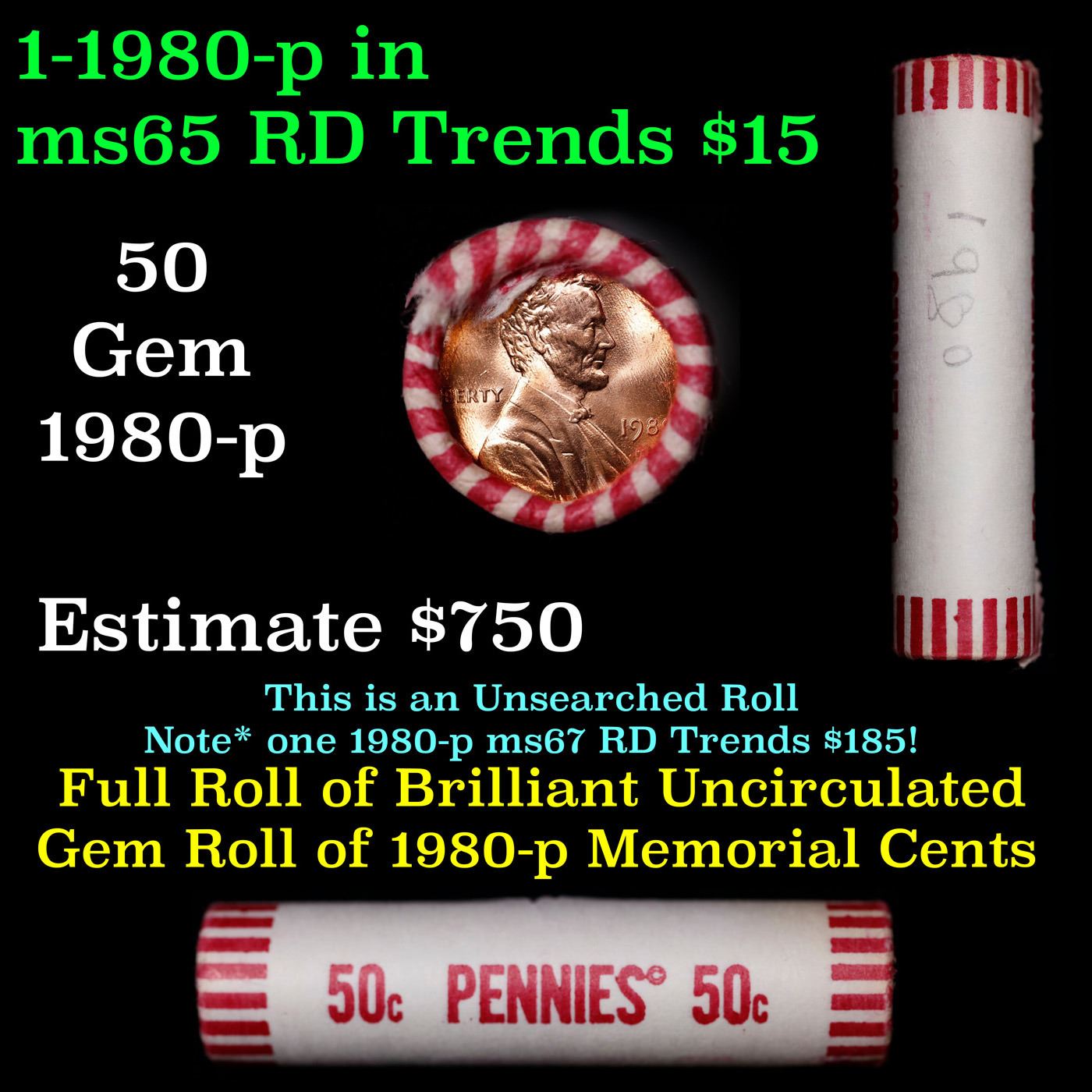Shotgun Lincoln 1c roll, 1980-p 50 pcs Wrapper.. A terrific Shotgun roll of Lincoln cents. Most if not all coin should be cherry red. Trends ms65 rd $15